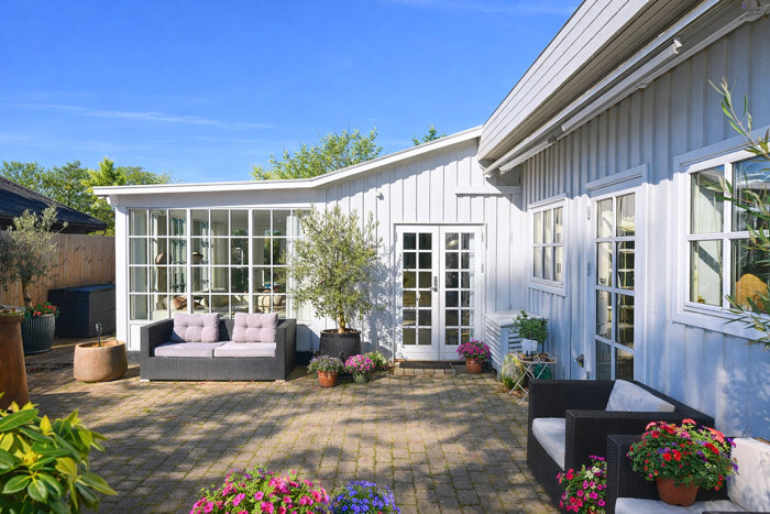 Inde og ude? Det er næsten et spørgsmål om fortolkning. Næsten alle rum åbner sig mod haven, og i sommerhalvåret bliver terrasserne naturlige forlængelser af boligen. Morgenkaffe i bare tæer. Lange aftener under åben himmel. Haven er frodig og fri, og her finder I også en stemningsfuld bygning til teenageren eller gæsten der vil overnatte ...denne er uregistreret.