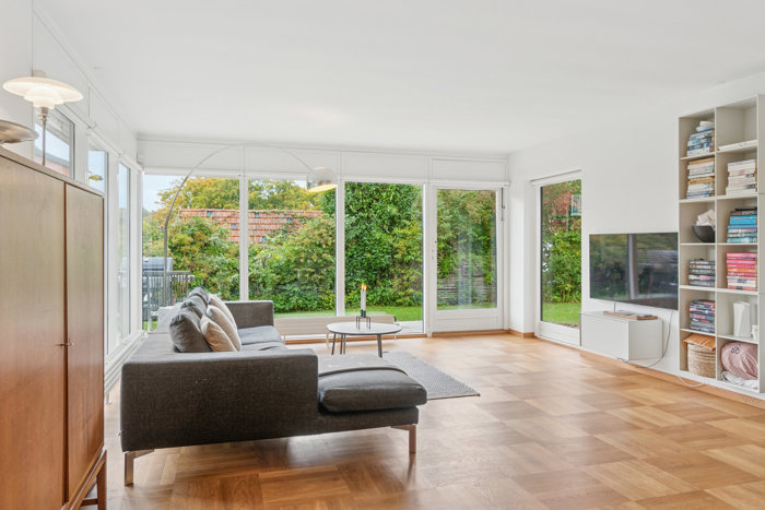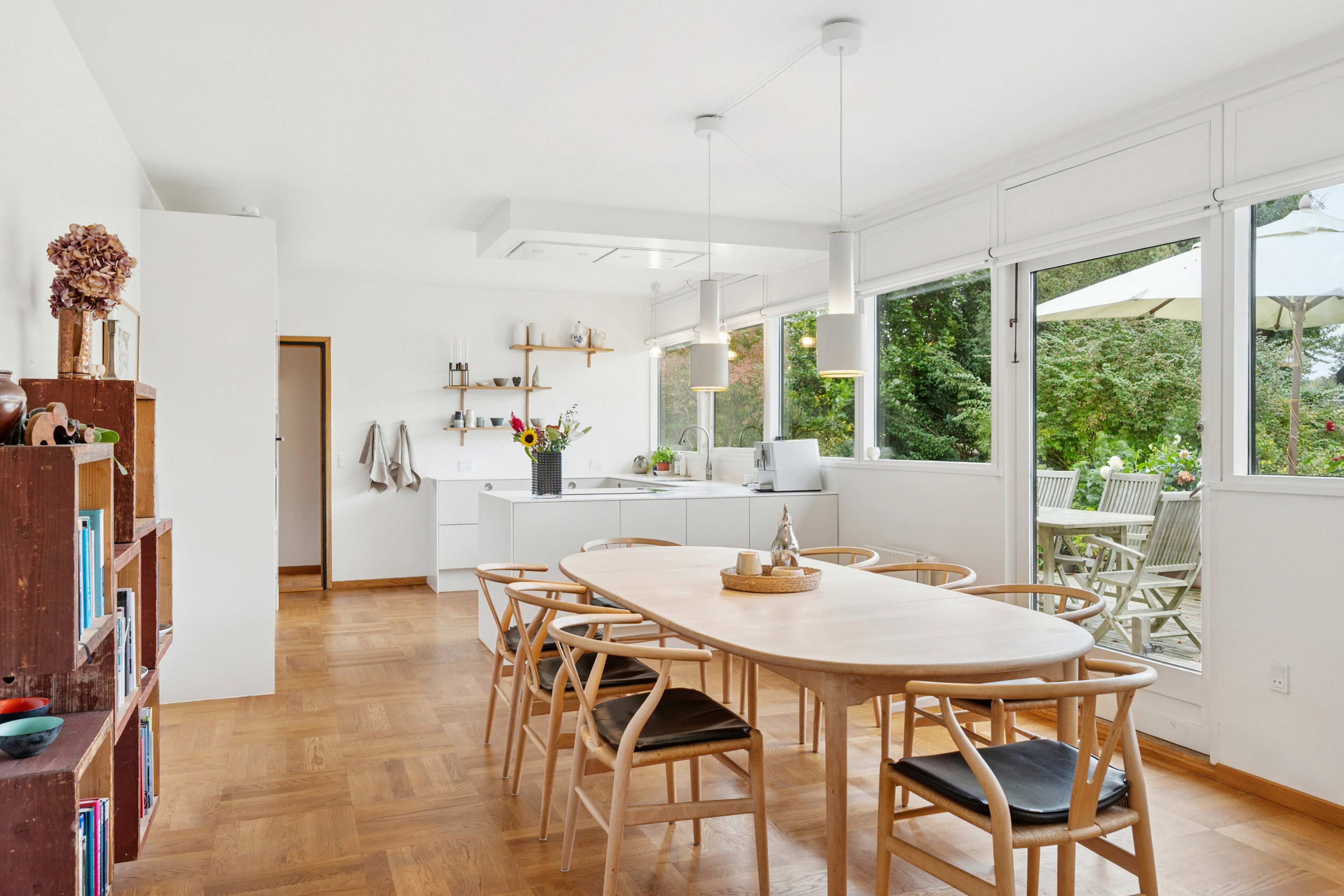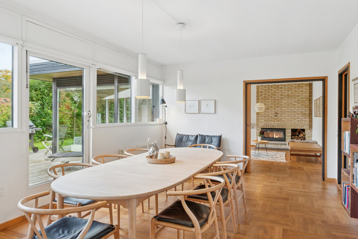 Det massive egetræsgulv er lagt i mosaikmønster. Sådan var det også originalt, og det får nu selskab af et raffineret køkken med hvide fronter og bordplader, og herfra er der videre delvis åben forbindelse til den store stue. Lyset strømmer ind ad de brede, loftshøje vinduer, og takket være den fine forbindelse til terrasserne udenfor, opleves hele opholdsmiljøet endnu større i hele sommerperioden.