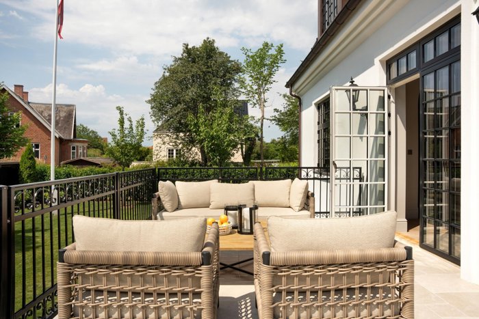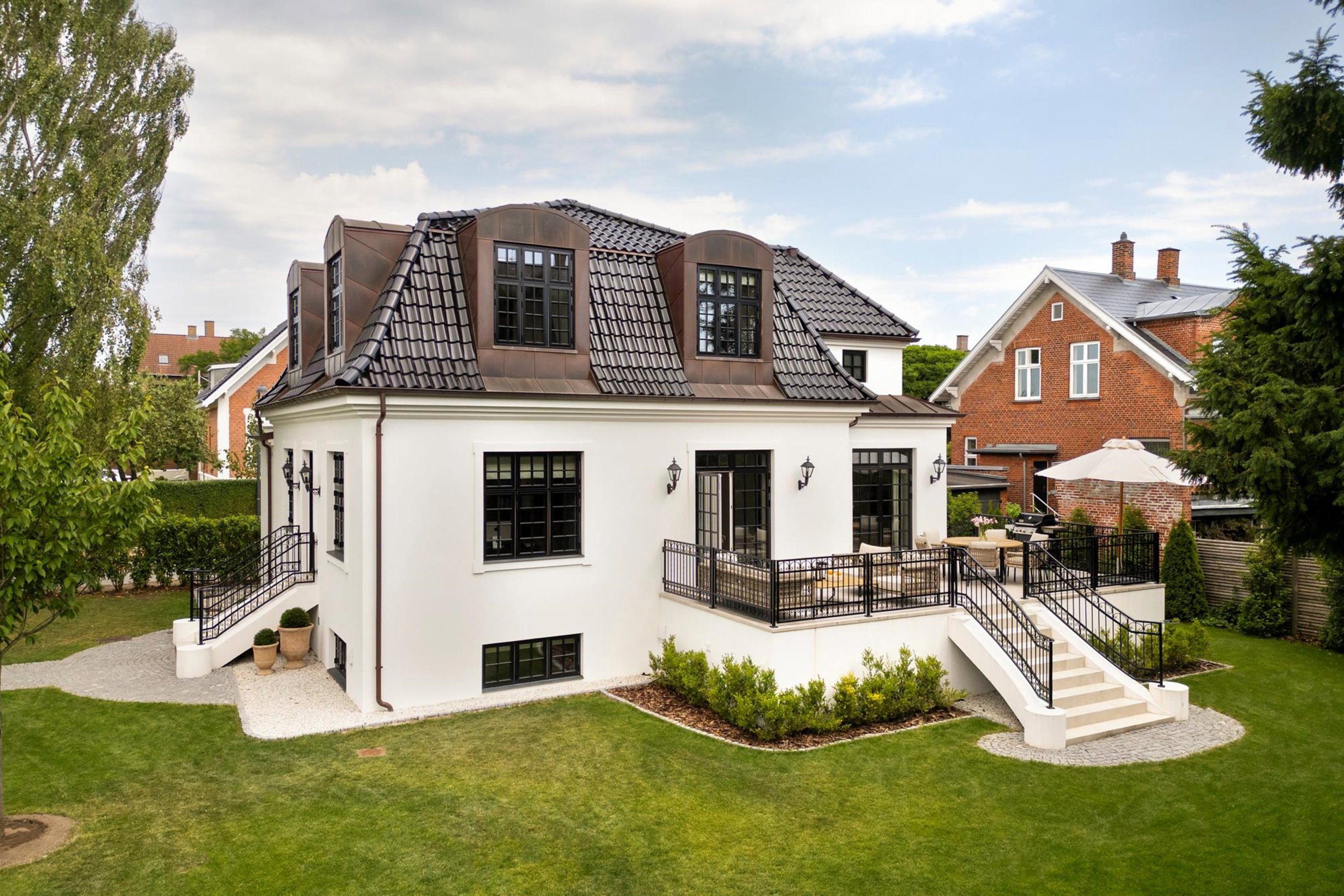 Udendørs ligger huset perfekt placeret på grunden, for enden af en stille blind vej, med sol fra morgen til aften og en sydvendt terrasse, der forlænger livet ud i det fri. Privat parkering til to biler og en atmosfære, der forener åbenhed og ro med selvtillid og elegance.