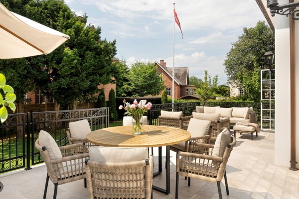 Køkkenet er skræddersyet med integrerede løsninger, bordplader i Silestone og hvidevarer fra Gaggenau og Miele. Badeværelserne er beklædt med marmorfliser fra Fired Earth, armaturerne fra Dornbracht, og selv tapeter og tekstiler er udvalgt med minutiøs præcision, heriblandt håndvævede flader fra Philip Jeffries og specialsyede gardiner. Flere møbler er designet specifikt til huset, så materialer og udtryk flyder naturligt fra rum til rum.
