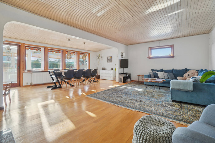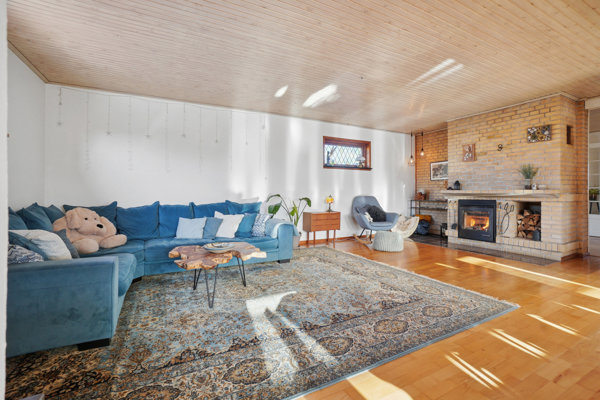 En pejsestue og yderligere to stuer udgør den store, lyse opholdssektion. Samtlige stuer ligger i åben forbindelse, og den ene har direkte udgang til udestuen. Fra en af de øvrige stuer er der adgang til det funktionelle køkken, der er holdt i hvidt.