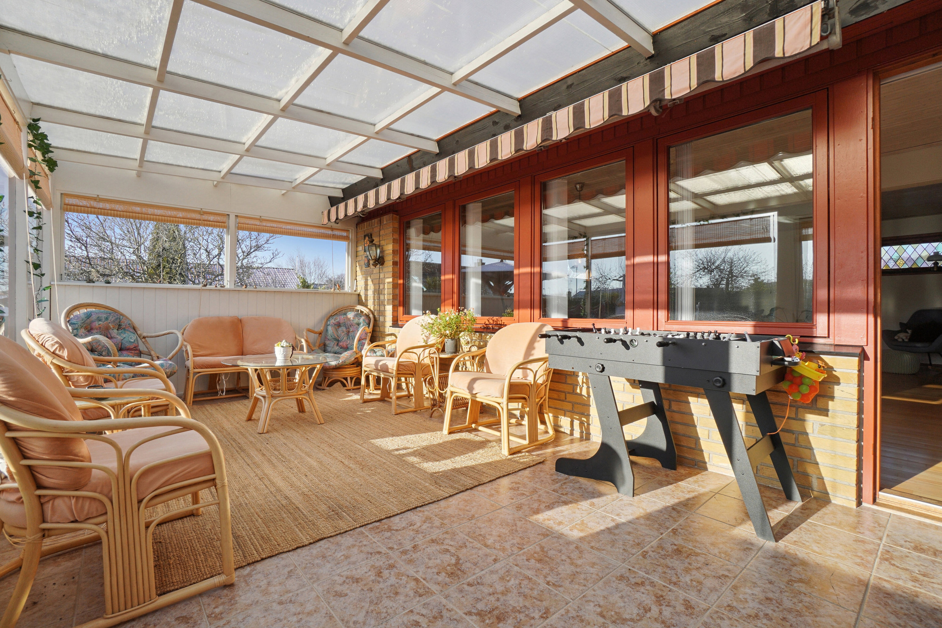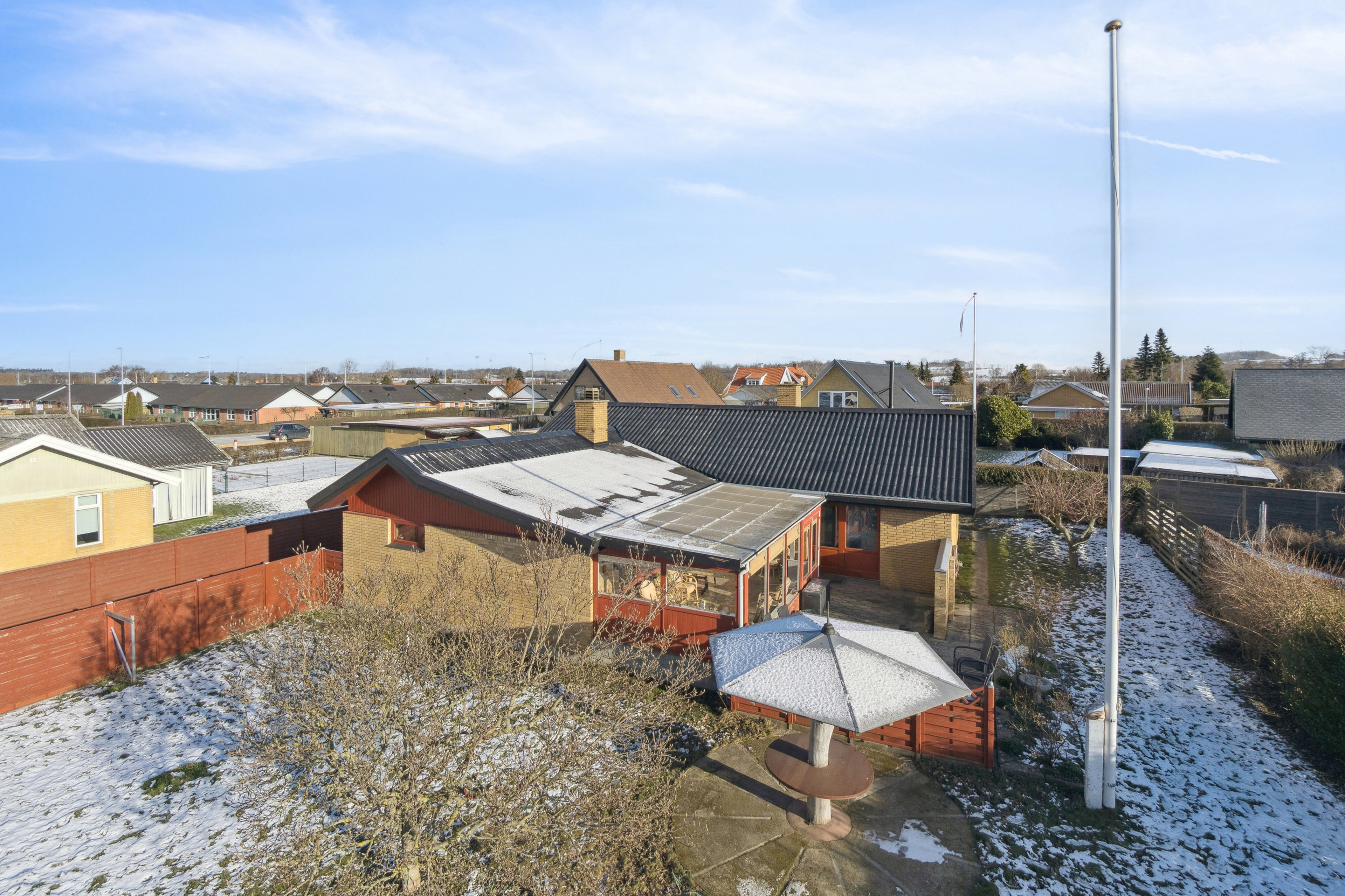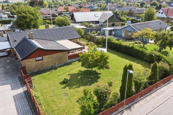 I overtager et hus fra 1975 – i gule mursten med sadeltag og røde detaljer. Boligen får følgeskab af en dejlig have og en carport, som har indbygget værksted. På havens græsplæne er der god plads til leg, mens fliseterrassen inviterer til hygge i solen. Husets udestue skaber en flydende overgang mellem inde- og udemiljø, ligesom den forlænger sommerperioden.