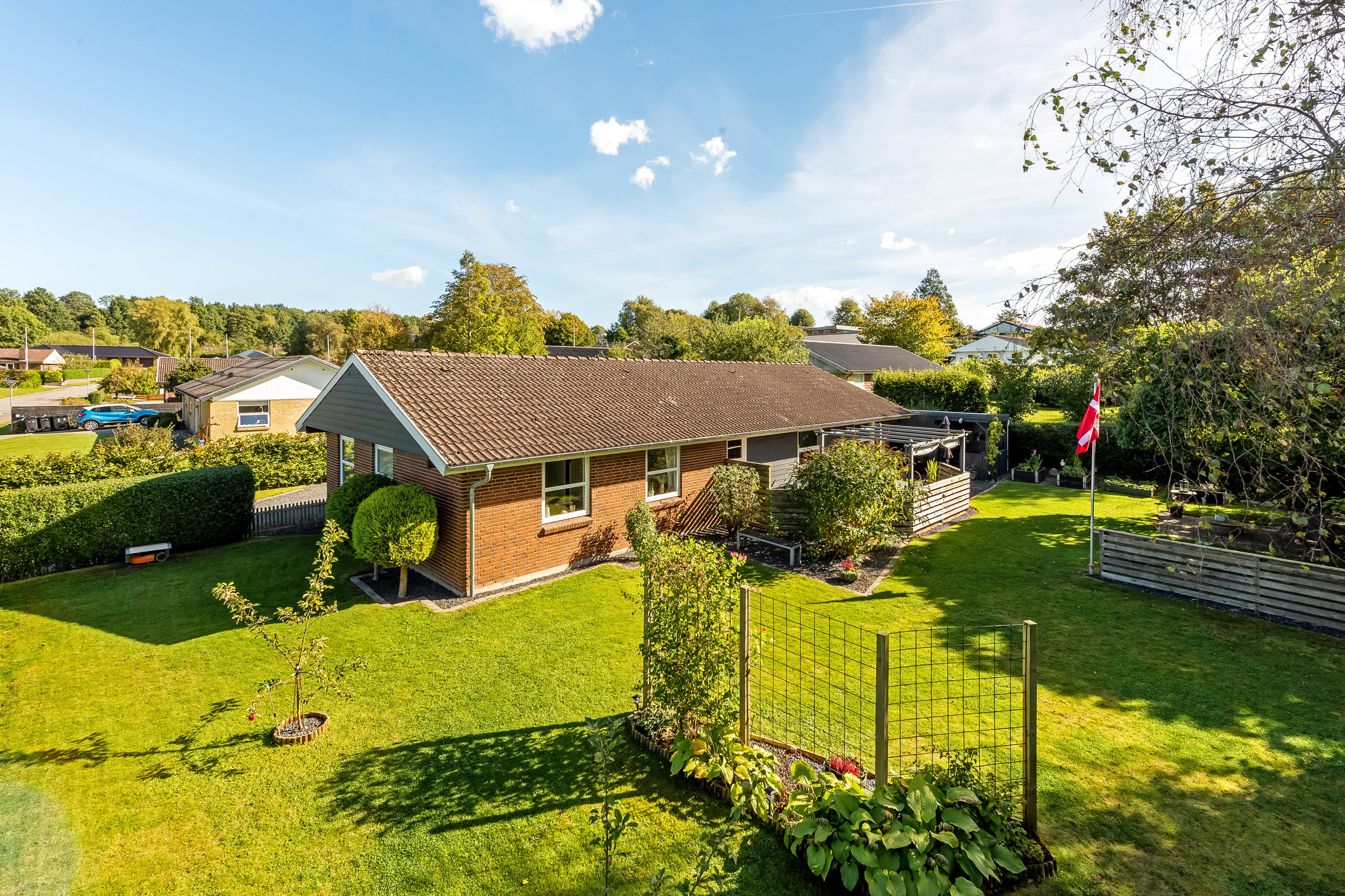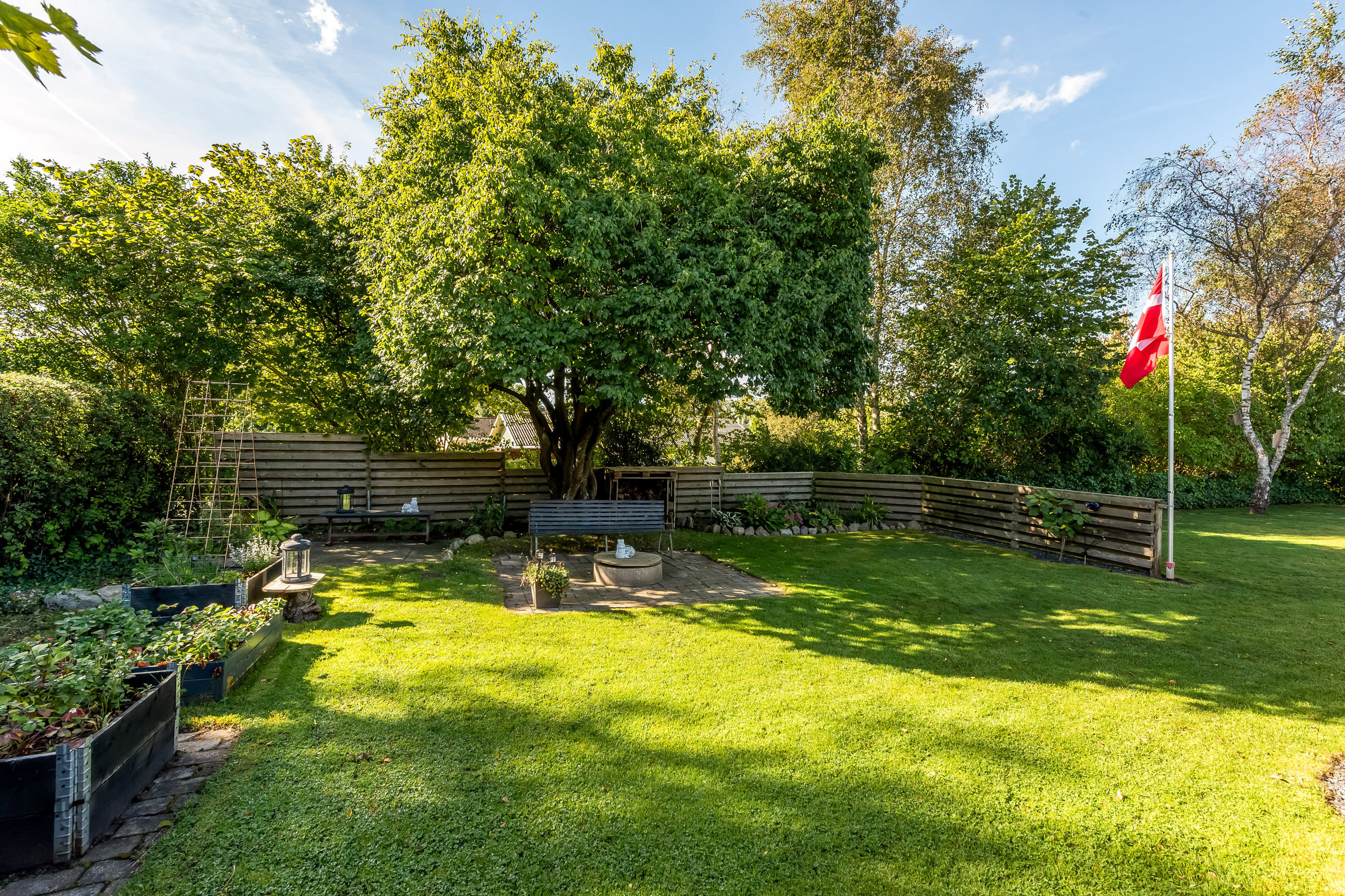 Ude venter en temmelig skøn have med dejlige hyggekroge, terrasser og plæne, hvor ungerne kan lege og spille bold. I får også højbede, tørrestativ og en indkørsel med plads til flere biler.