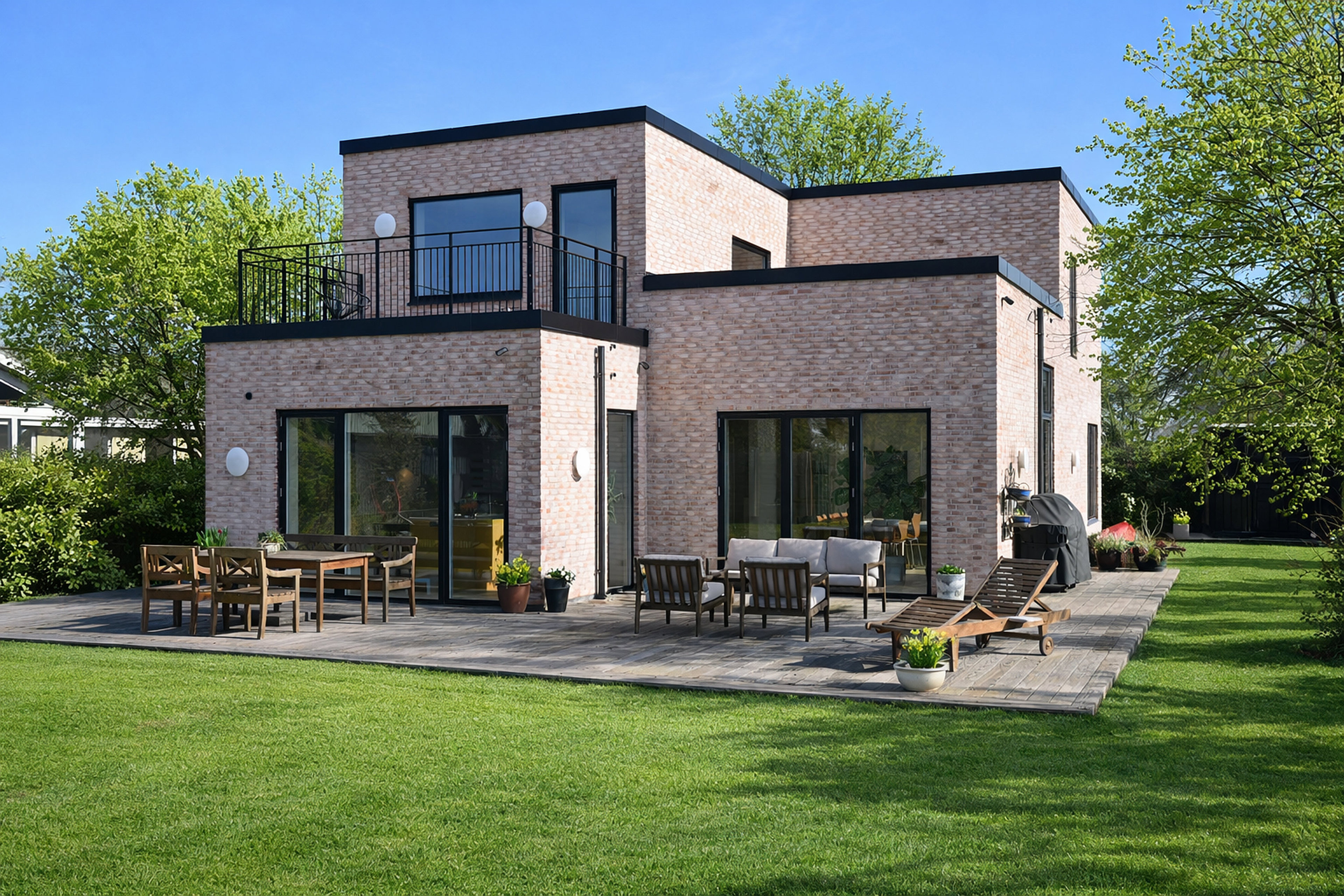 Arkitekturen fremstår smukt i terrakottafarvede mursten fra Egernsund Wienerberger. Belysningen er nøje udvalgt med spots fra FaustLight samt udendørslamperne Eklipta, designet af Arne Jacobsen.Boligen er desuden udstyret med sauna, praktisk teknikum med vaskefaciliteter og husets energisystem med jordvarme samt ventilationsanlæg, blødgøringsanlæg, solceller med batterilagring og ladestander til elbil.