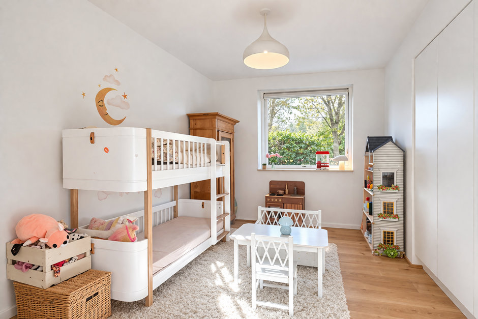 Børneafdelingen rummer to gode værelser og et lækkert badeværelse. På førstesalen findes en åben repos med adgang til værelse og udgang til en solrig altan. Forældrene har deres egen rolige afdeling med walk-through garderobe, soveværelse med fransk altan samt privat badeværelse med kar og brus indrettet med armaturer fra VOLA.