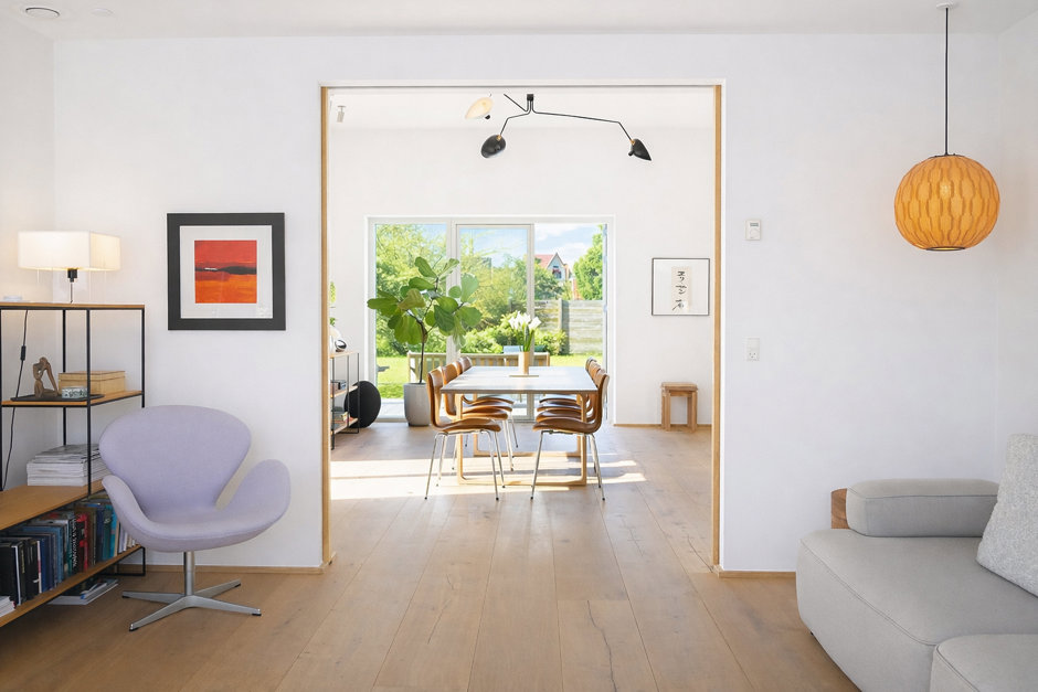 Her er et hjem skabt med en sjælden grad af omhu, passion og kompromisløshed. Her er intet tilfældigt. Hver eneste linje, samling og materialevalg er resultatet af et skarpt arkitektonisk blik og en tålmodig proces, hvor kvalitet og æstetik har været styrende hele vejen.
