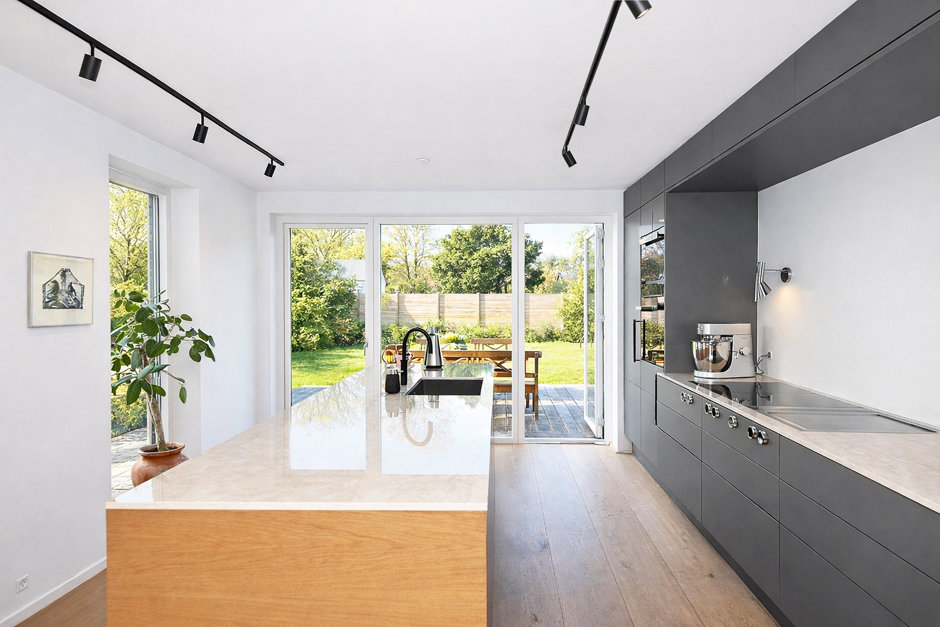 Planløsningen er ideel til familien med to børn og byder på en indbydende hall, spisestue og dagligstue adskilt af lydtætte skydedøre. Husets naturlige samlingspunkt er det store køkkenalrum med kaffestation og markant køkkenø. Køkkenet er fra Kustom House i naturolieret eg og udstyret med BORA Professional med Teppanyaki.