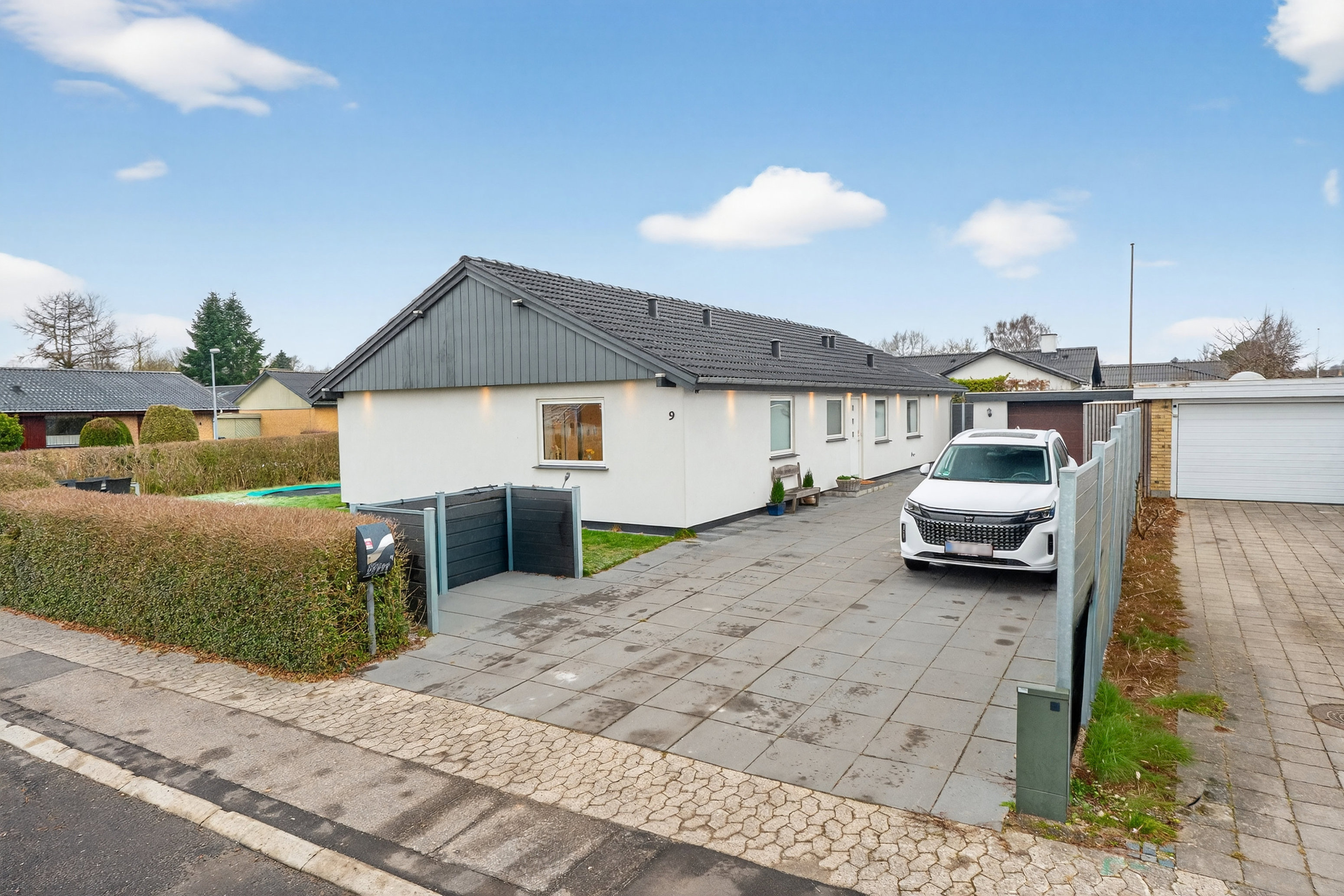 Også haven har været i kyndige hænder, som lagde rullegræs og flisebelægning på plads i 2022. Ved den nordvendte gavl har man udnyttet pladsen til en overordentligt stor og ugeneret fliseterrasse, hvor I dagen igennem kan finde sol eller skygge efter ønske.