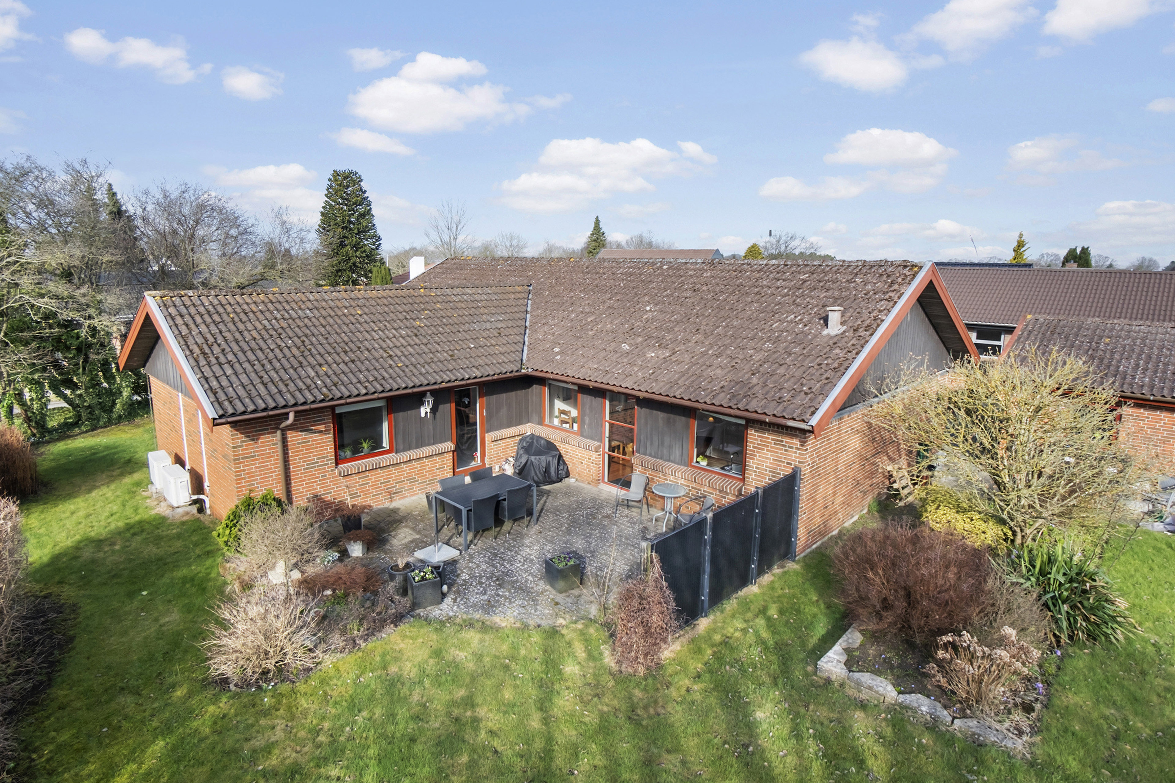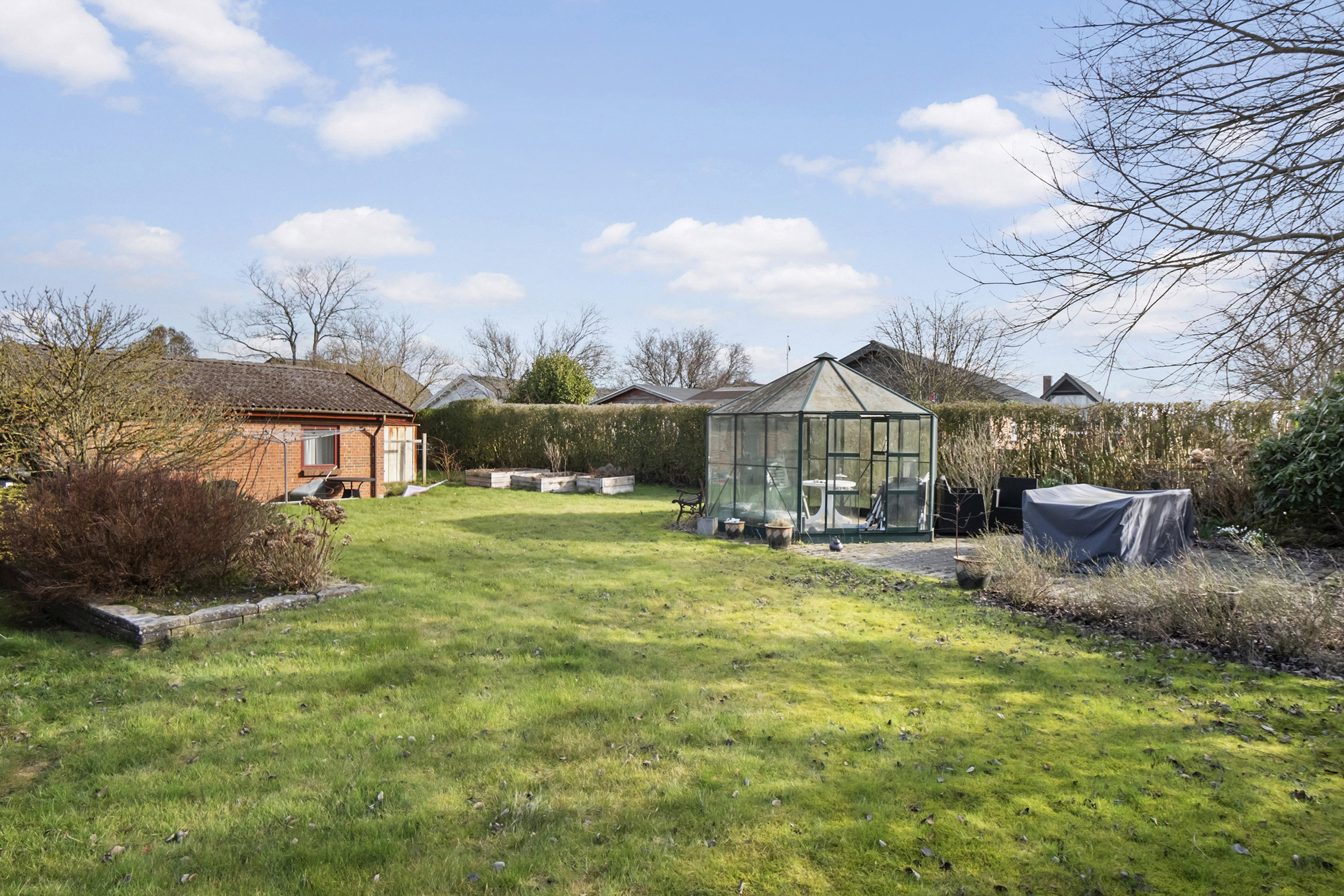 Beliggende på en god stor hjørnegrund hvor udelivet kan nydes på flere skønne terrasser og har du grønne fingre, kan du udøve dine evner i havens højbede og dyrke tomater i den fine havepavillon.