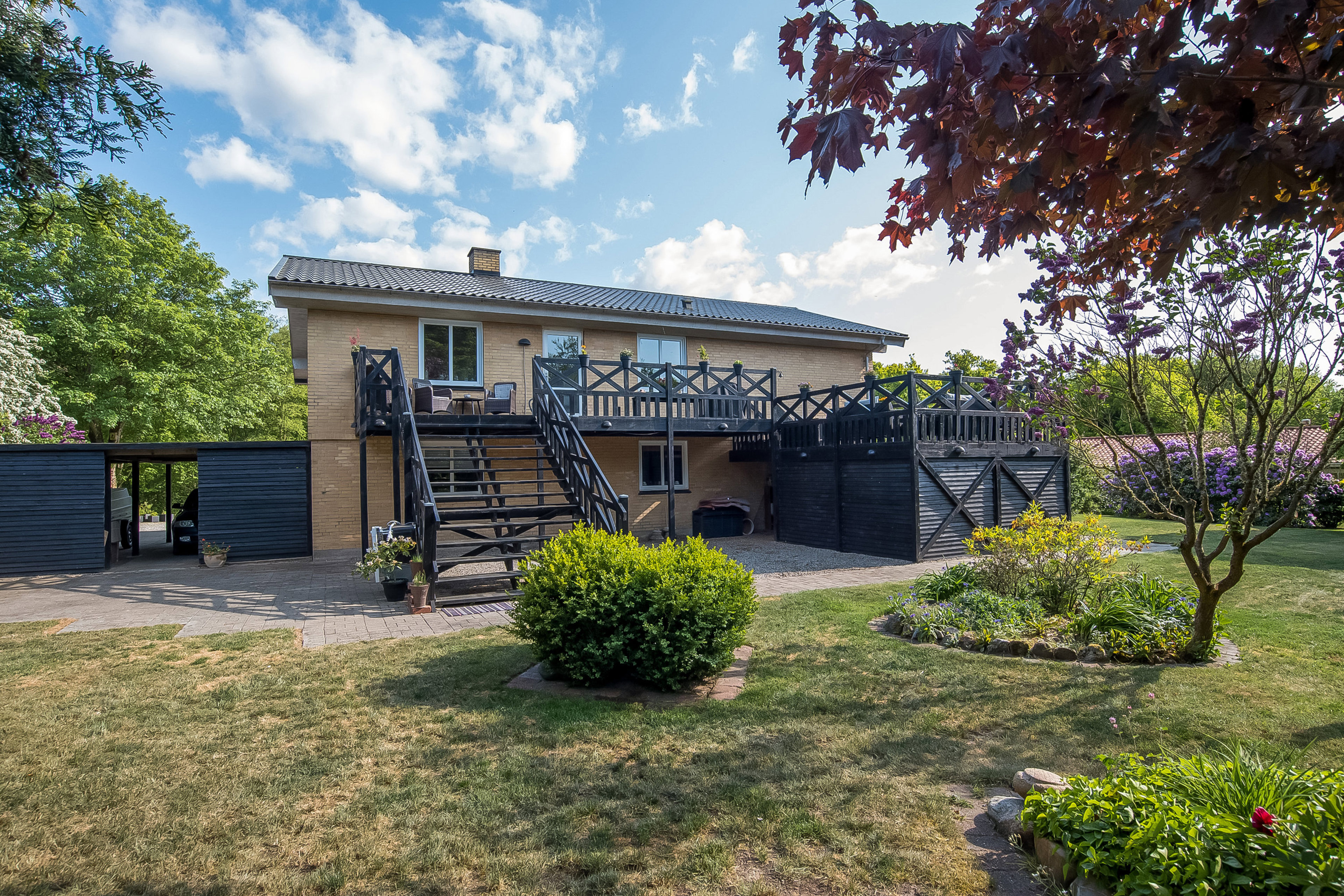 Haven er et kapitel for sig. Den over 3.400 m² store grund er anlagt med smukke staudebede, slyngede stier og fuldvoksne træer, der giver læ og privatliv. Flere terrasser og lækroge indbyder til udeliv hele dagen, og her er god plads til både leg, afslapning og haveprojekter. Alt fremstår velpasset, men med rig mulighed for selv at sætte præg.