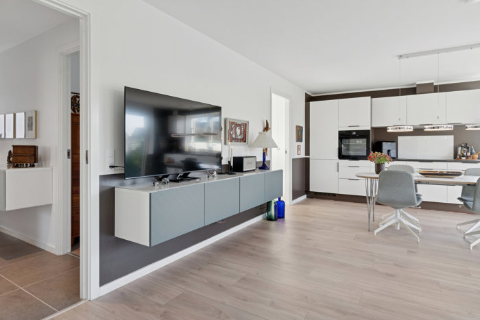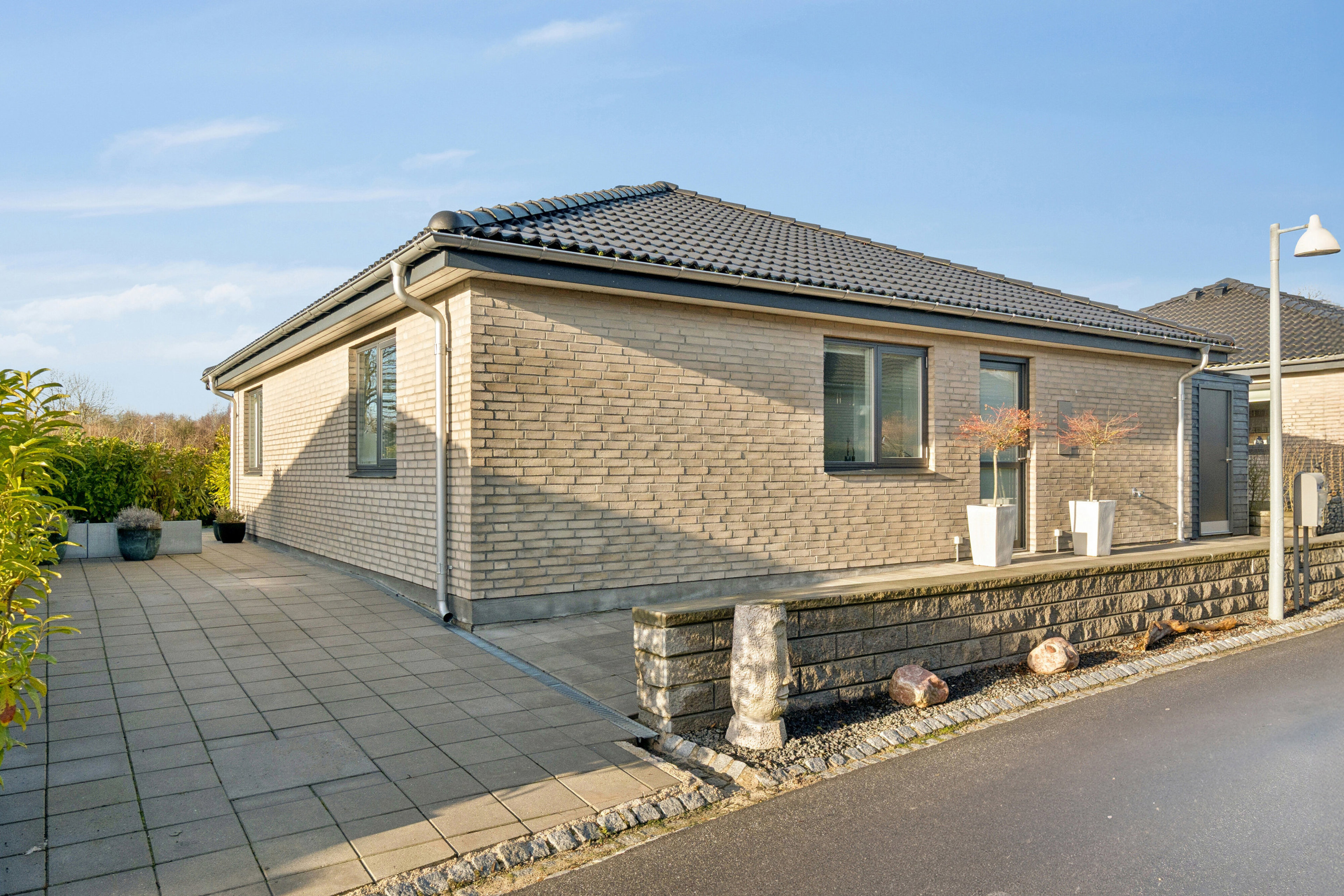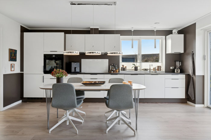 Udefra fremstår villaen med en skarpskåret murstensfacade. Lyse sten ledsages af et mørkt tag, og bag murene er det særligt den markante stue, der løber med opmærksomheden. Stuen er kendetegnet ved et rigt lysindfald, og køkkenet sammesteds er nydeligt udført med hvide, glatte fronter og sorte bordplader. Ovn og emhætte er fra 2025, og Quooker har fået nyt filter i august 2025.