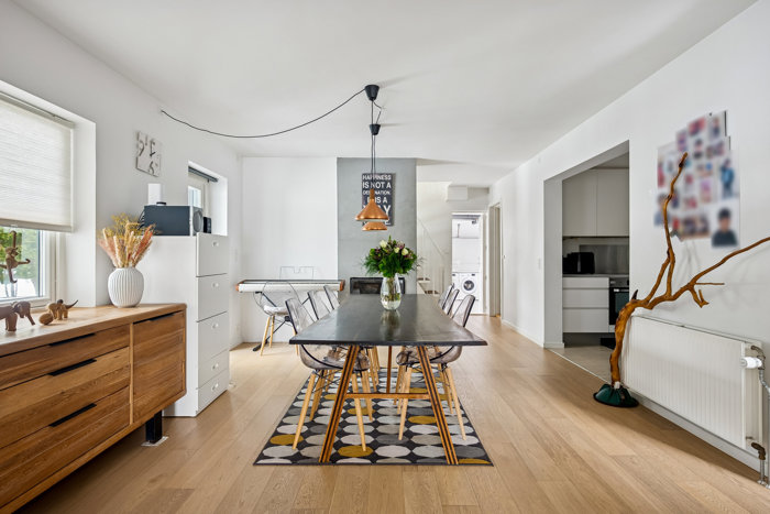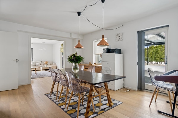 Det hele starter i entréen, hvor der er god plads til overtøj, skoletasker og deslige. Herfra åbner hjemmet sig mod et dejligt køkken-alrum, der samler hverdagen. Det er her, livet leves; madlavning, gæstemiddage, lektier ved spisebordet og samtaler, der trækker ud; og i forlængelse finder I den store, lyse stue. Tilbage i alrummet er der udgang til udestuen, som forlænger sæsonen i begge ender og skaber en flydende overgang mellem inde og ude.
