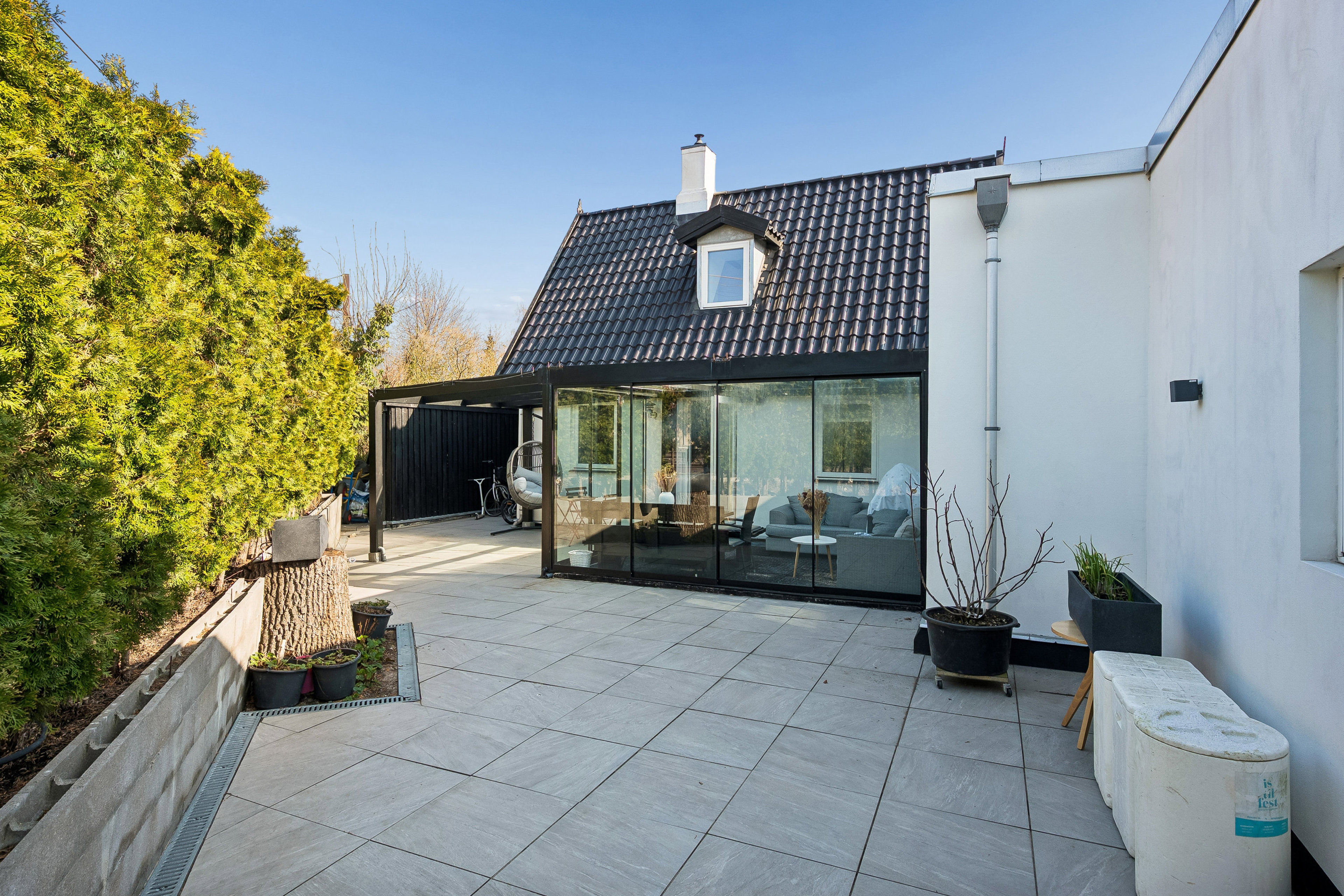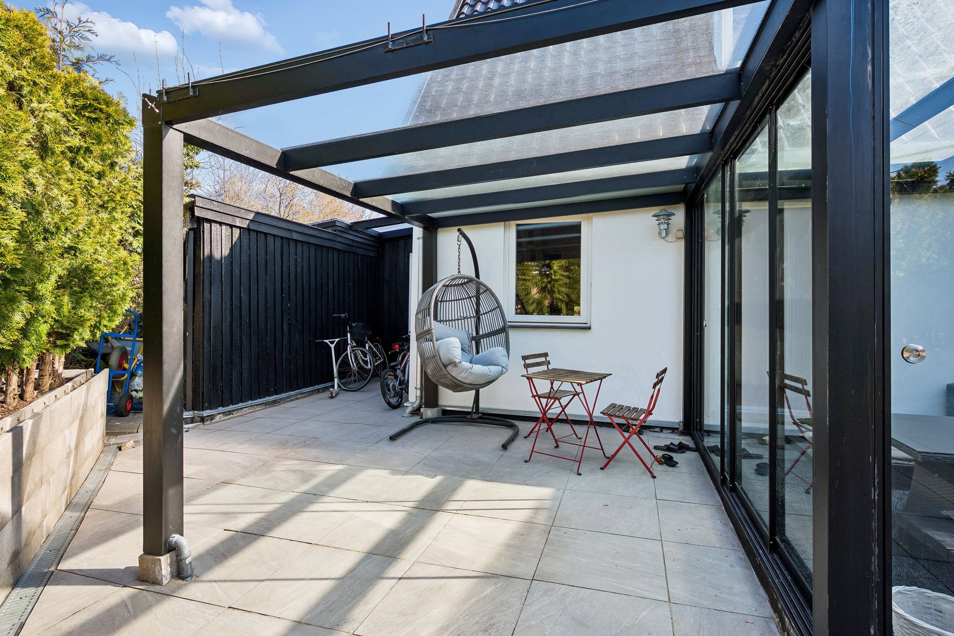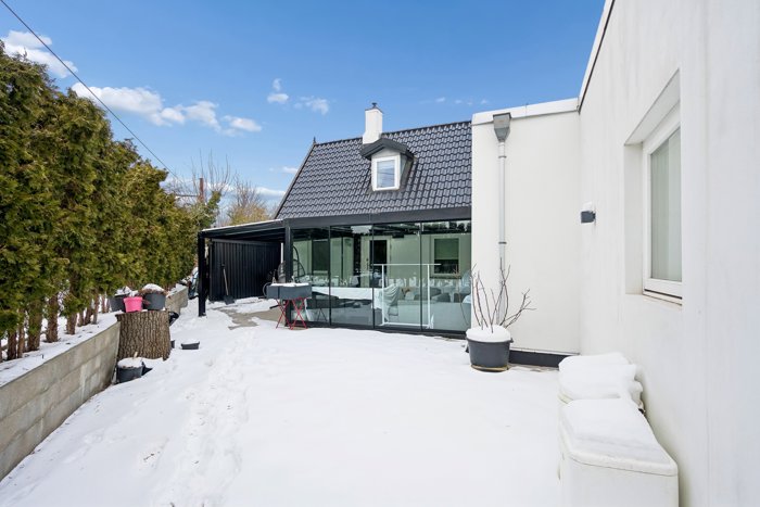 Udelivet får ligeledes lov til at blomstre her på matriklen. Foruden udestuen kan I tage plads under overdækket, mens børnene boltrer sig i haven. Den store indkørsel sørger desuden for, at bilerne parkeres nemt og bekvemt.