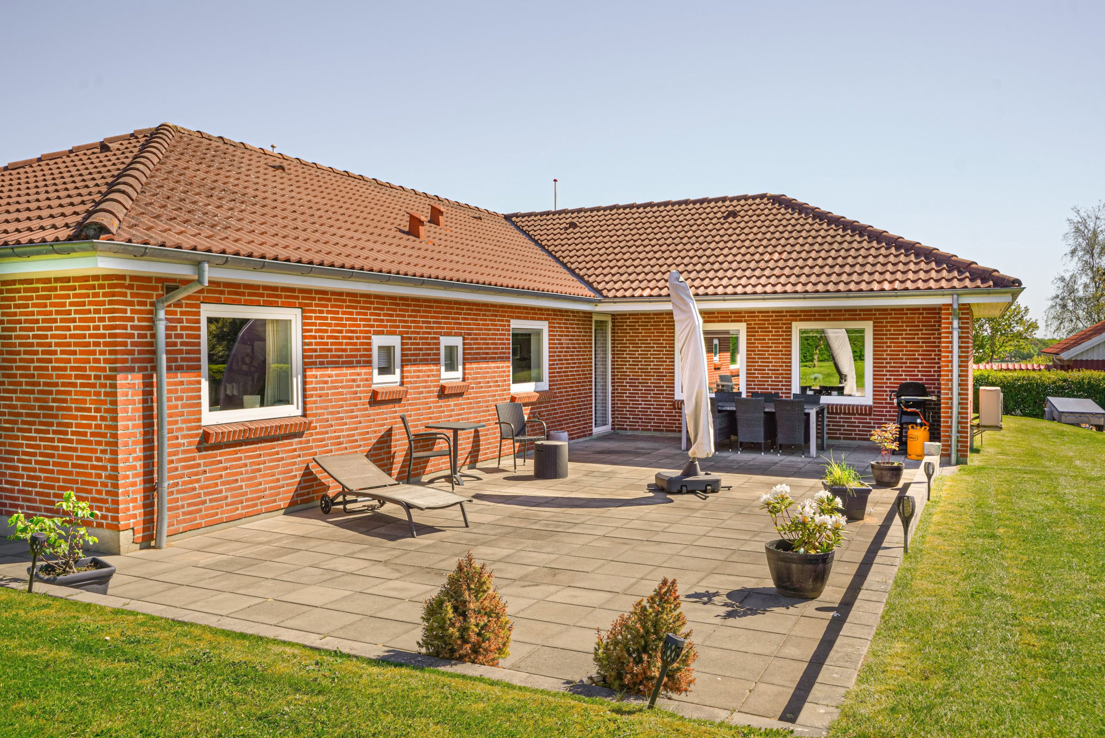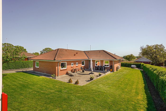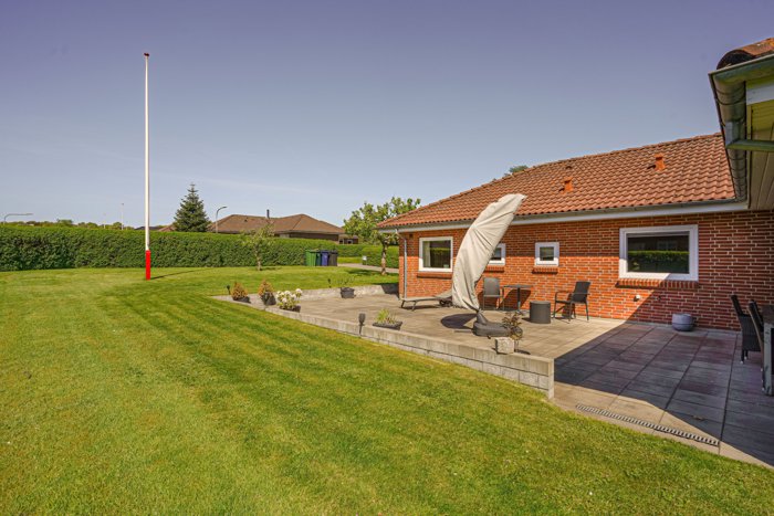 Udendørs venter en stor grund på 896 m² med god plads til leg, ophold og afslapning. Haven fremstår overskuelig og velholdt med store græsarealer, hæk omkring grunden og en dejlig terrasse, hvor solen og de rolige rammer kan nydes. Hertil kommer en garage på 33 m², som giver ekstra plads til bil, værksted, opbevaring eller fritidsudstyr.