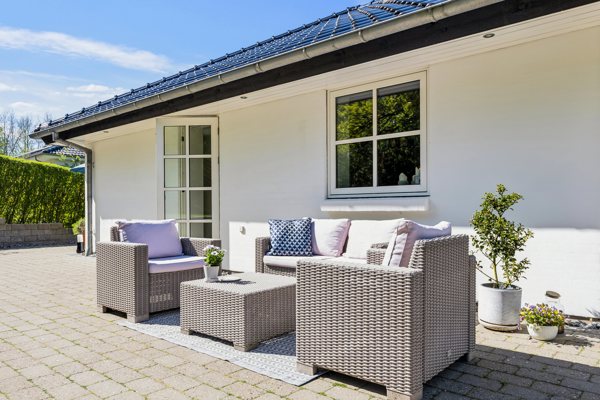 Den grønne kulisse skaber ikke blot en privat og fredfyldt atmosfære, men inviterer også til udeliv året rundt, med stier, fuglesang og fri adgang til naturen lige uden for døren.