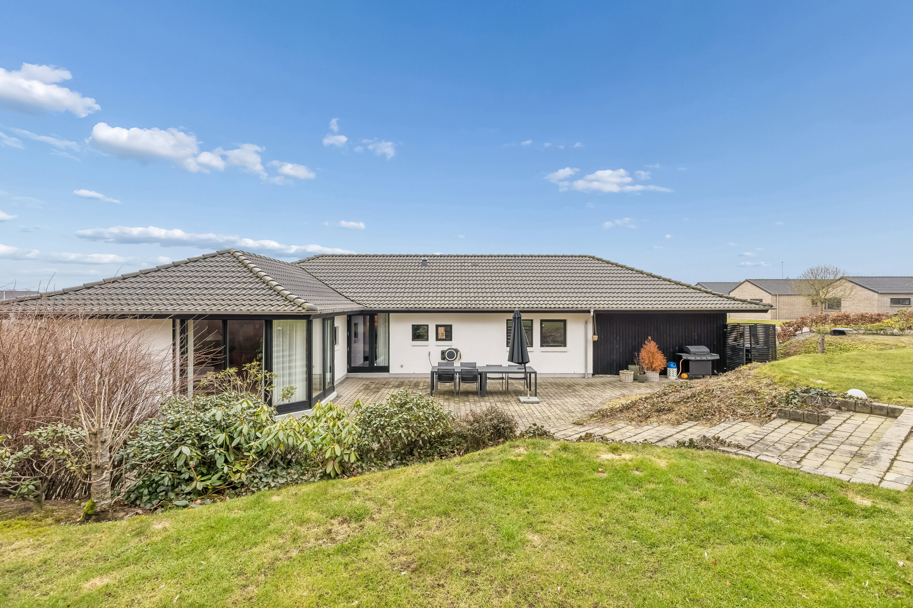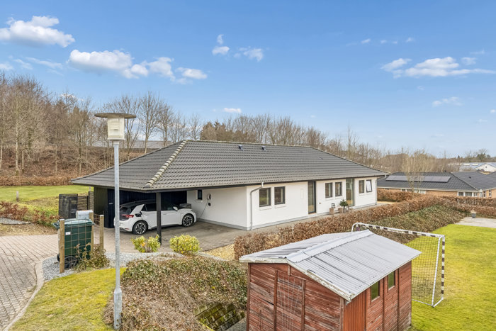 Udendørs venter en dejlig grund med terrassemiljø, hvor der er plads til både afslapning og hyggelige grillaftener. Hertil kommer carport samt udhus med gode opbevaringsmuligheder.