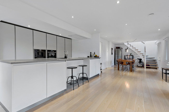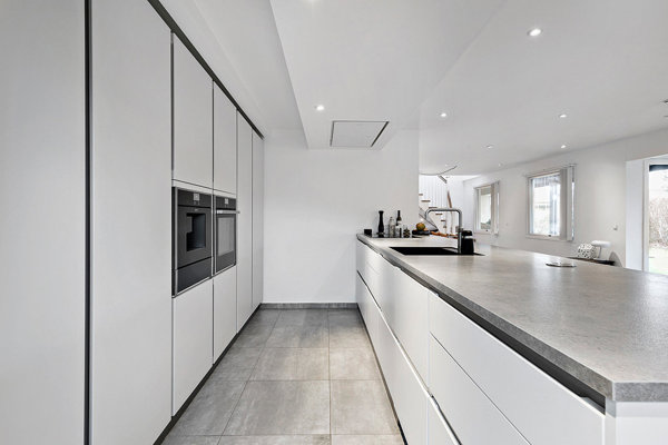 Køkkenet er moderne og veldisponeret med god skabsplads og alt i hårde hvidevarer – herunder indbygget kaffemaskine.