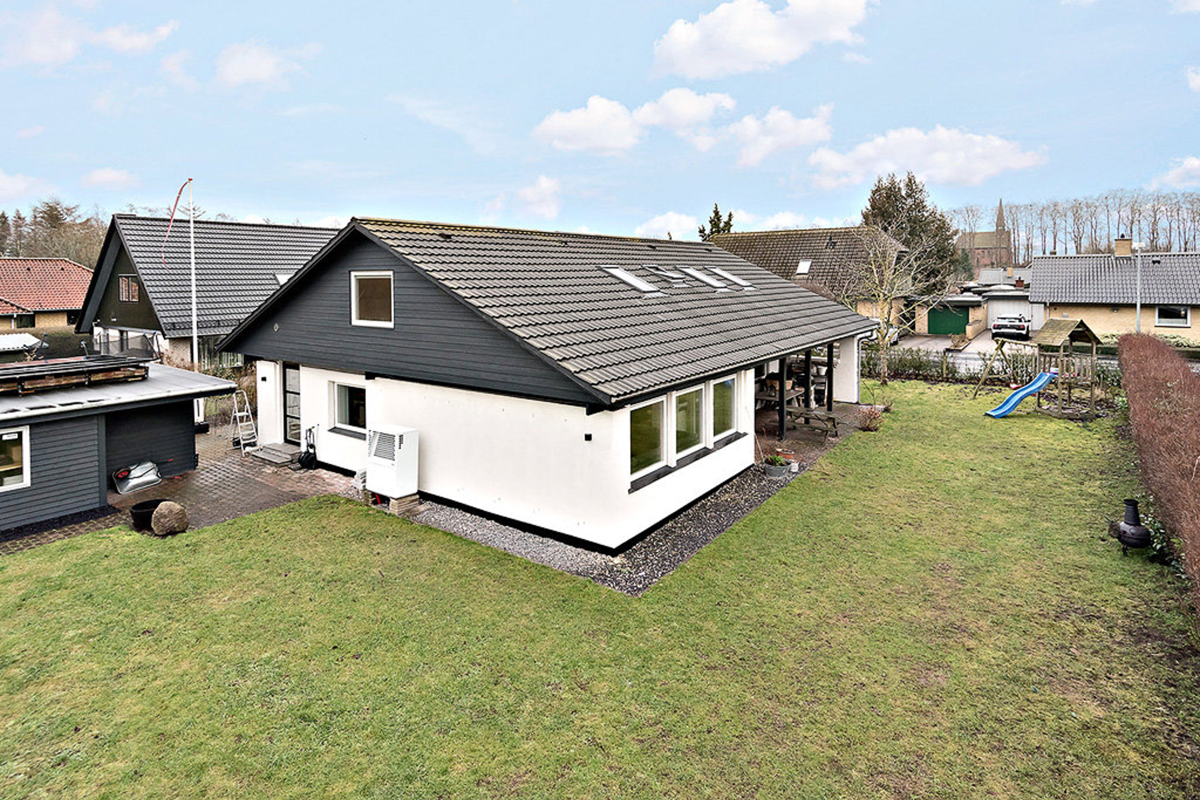 Haven er anlagt med plads til leg, afslapning og hyggelige stunder. Grunden på 805 m² byder desuden på carport, istandsat garage på 28 m2 fra 2021, med automatisk skydeport, samt gode parkeringsforhold.