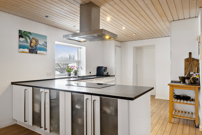 Boligen byder på en gennemtænkt og moderne planløsning med klare zoner til både ophold, privatliv og praktiske funktioner. Man bydes velkommen i entréen med adgang til bryggers, hvor der er god plads til hverdagens gøremål og ekstra opbevaring. Herfra ledes man videre ind i boligens hjerte – det åbne køkken-alrum, hvor køkken og spisestue smelter naturligt sammen og skaber et lyst og indbydende opholdsrum med god plads til både hverdag og gæster.
