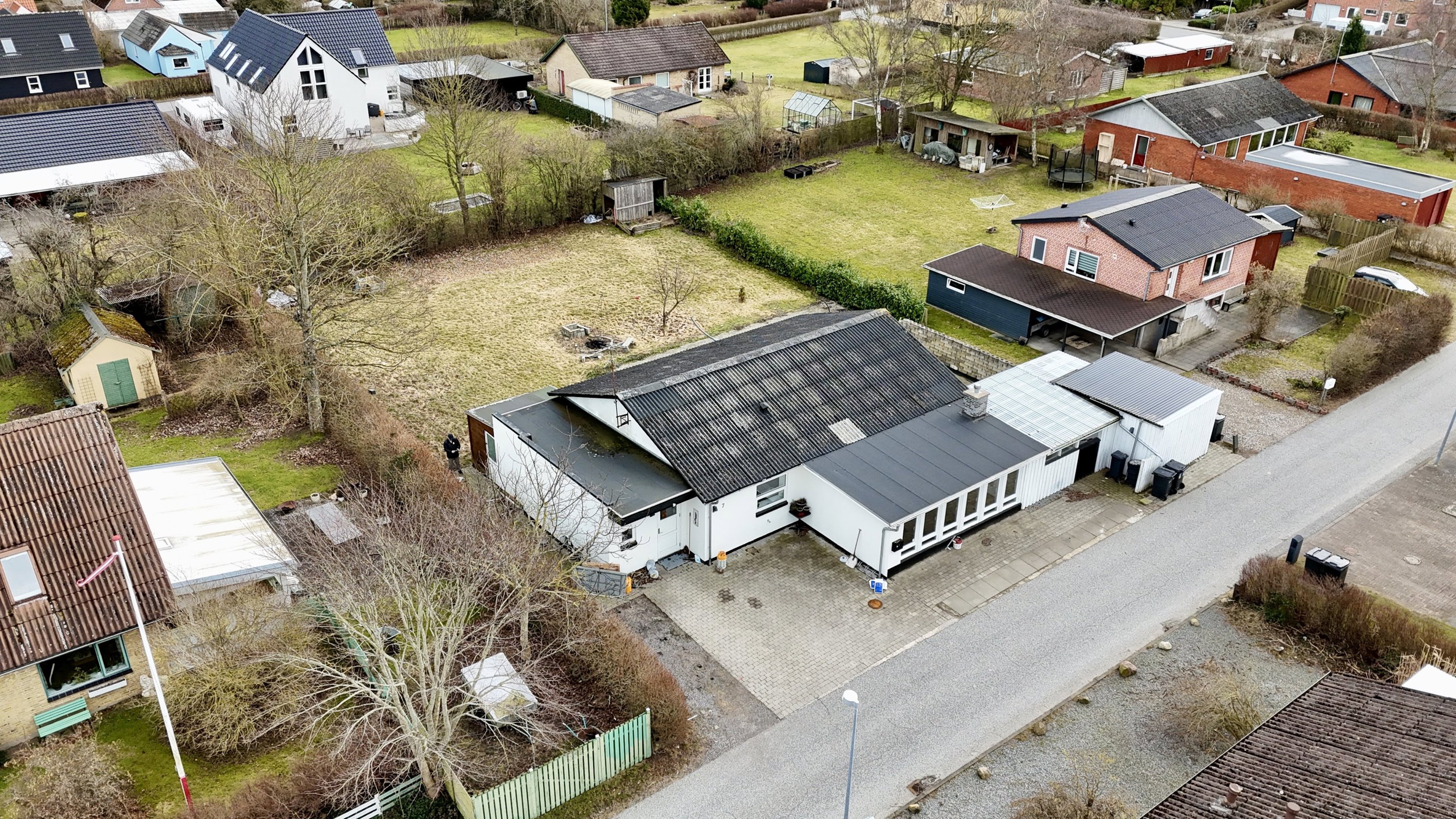 Boligen rummer desuden tre regulære værelser, som er ideelle som børneværelser, kontor eller gæsteværelse, samt et pænt badeværelse placeret centralt i huset. Planløsningen suppleres af flere disponible rum og skure, som giver ekstra opbevaringsplads og fleksibilitet.