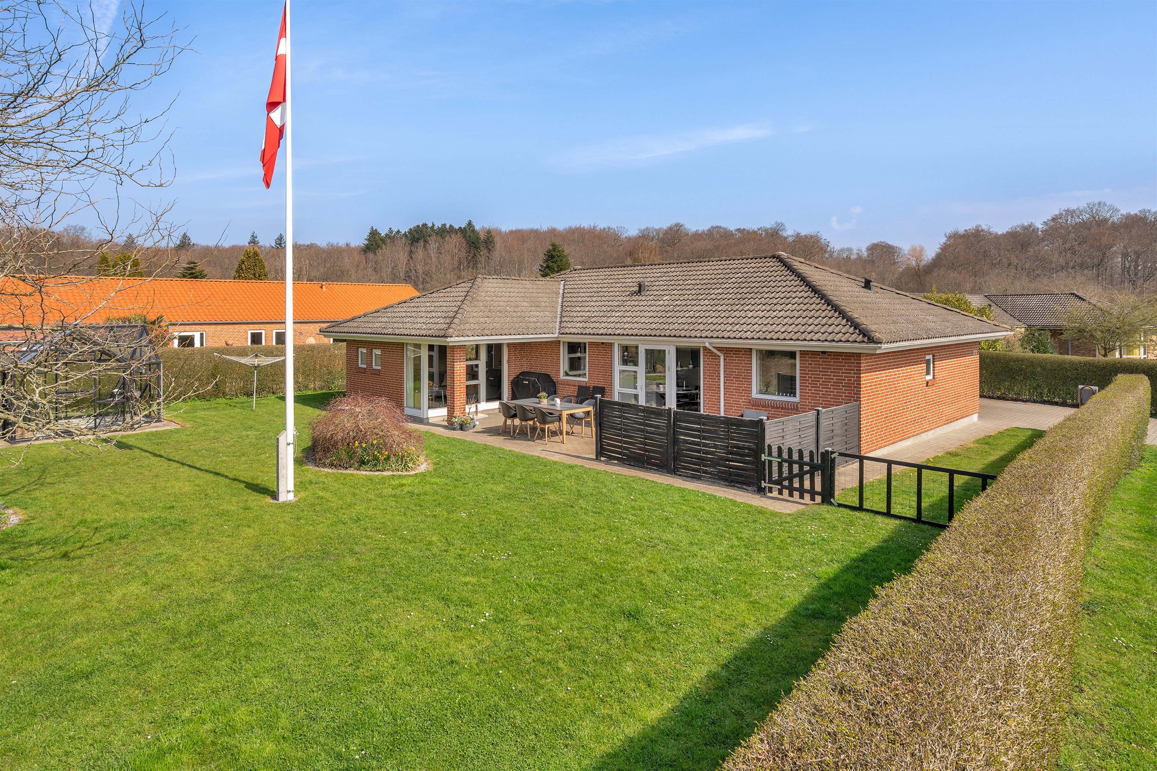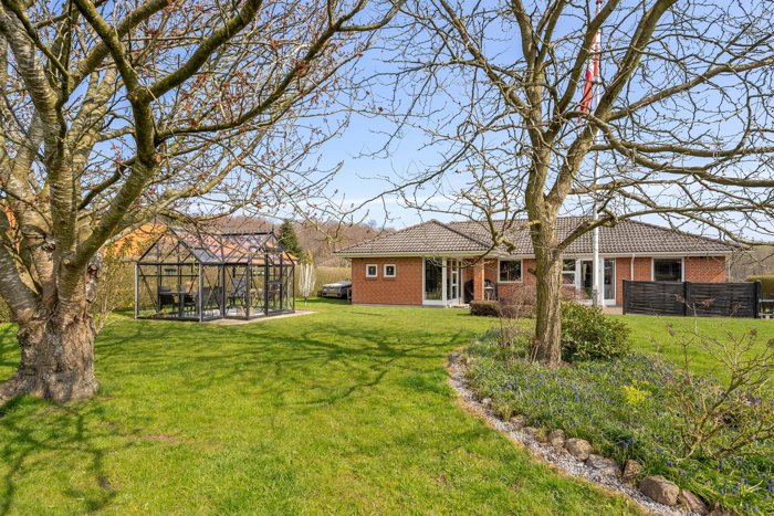 Udenfor parkeres bilen i carporten, og der er desuden et godt udhus med plads til værksted eller opbevaring. Haven er virkelig skøn og indbydende med græsplæne, beplantning og et flot drivhus, som næsten har karakter af et lille orangeri – perfekt til lange sommeraftener og hyggelige stunder.