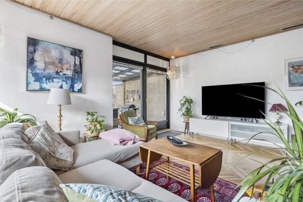 Boligens naturlige samlingspunkt er det store og lyse køkken-alrum, hvor et flot hvidt køkken med masser af skabsplads ligger i åben forbindelse med spiseafdeling og stue. De store vinduespartier giver et fantastisk lysindfald og skaber en smuk forbindelse mellem inde og ude. Herfra er der både udsigt til og direkte udgang til den hyggelige, lukkede og sydvestvendte have samt de skønne terrasser, hvor sommerens lange aftener kan nydes i fredelige omgivelser.