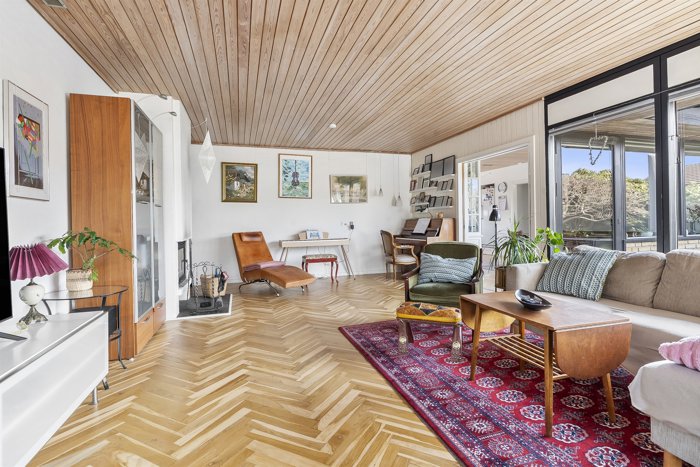 Opholdsrummene og værelserne fremstår smagfuldt indrettet med blandt andet smuk sildebensparket, og flot lysindfald, som giver boligen et elegant og tidløst udtryk.