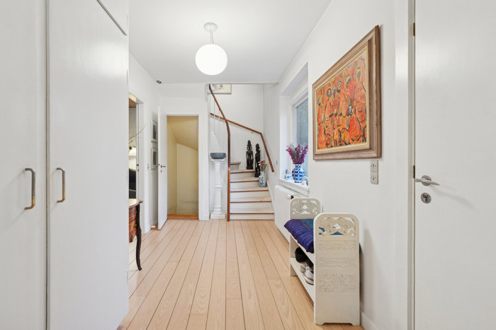 Fra stuen er der udgang til husets store, sydvendte terrasse. På førstesalen kan I fra reposen bevæge jer rundt til tre gode værelser – det største med en fransk altan og en herlig udsigt hele vejen ned til de store træer for enden af haven – samt et moderne og stilrent badeværelse med gulvvarme.