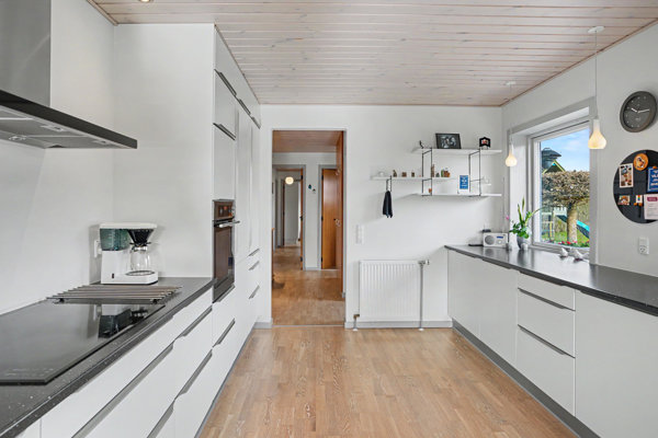 Modsat fordeler gangen møder man husets hjerte for familiens samling. Køkken/alrummet består af det elegante og stilfulde køkken holdt helt i hvidt samt spiseområdet med masser af lysindfald.