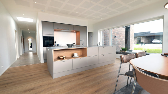 Villaens naturlige samlingspunkt er det store, åbne opholdsrum med køkken og stue i ét. Her skaber loftshøjde, store vinduespartier og et flot lysindfald en eksklusiv atmosfære og en fantastisk rumfornemmelse. Køkkenet fremstår stilrent og moderne med god skabsplads og plads til både hverdag og gæster.