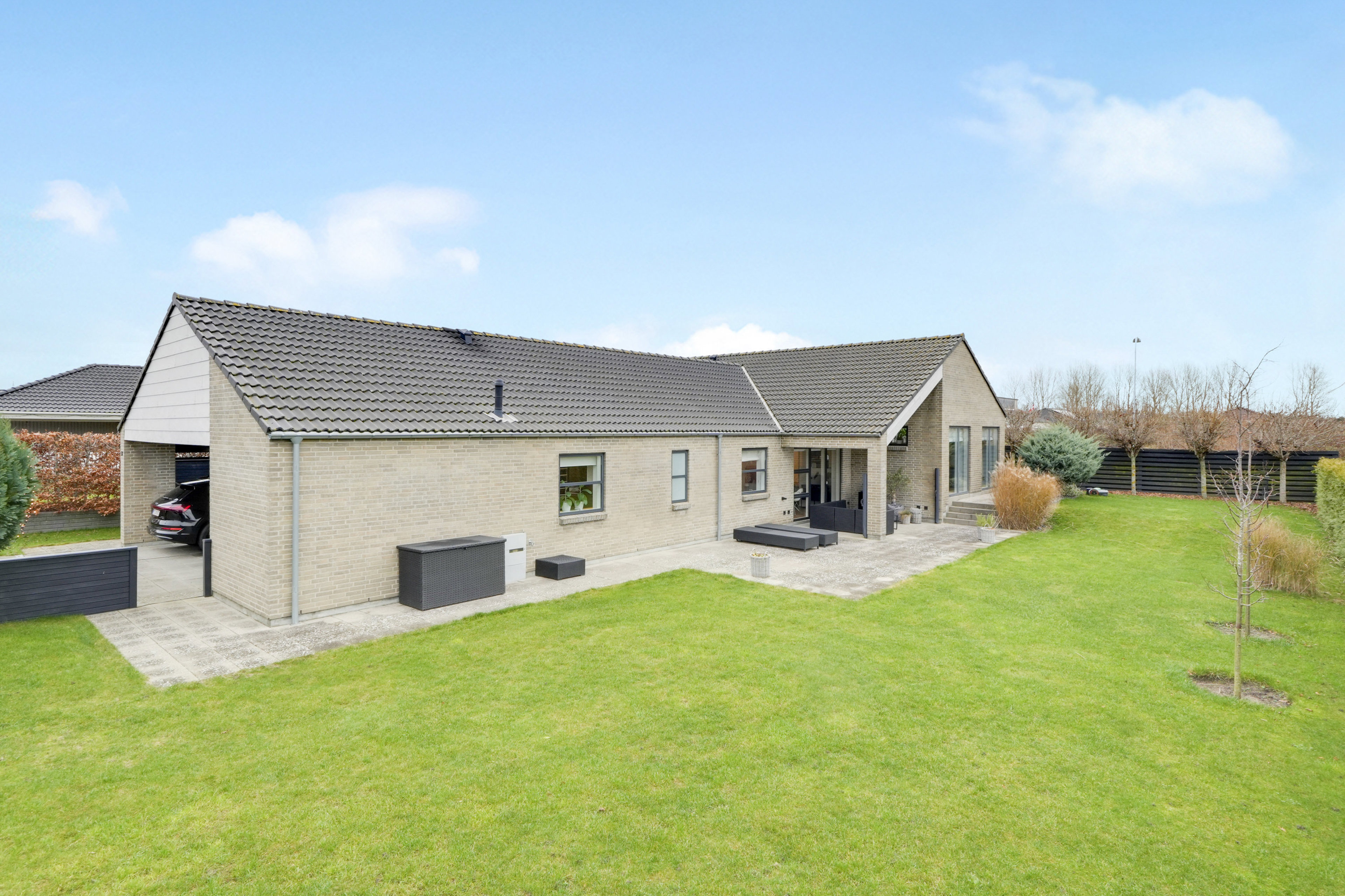 Én af husets helt store forcer er, at ejendommen er fuldkommen fri for ad hoc-løsninger. Alt er gennemtænkt på forhånd, så alle komponenter falder i hak. Se bare på den lækre fliseterrasse, som taget er ført ud over, for resultatet er en virkelig fin harmoni mellem udtryk og funktion. Ydermere er selve haven nydeligt anlagt med plæne, varieret beplantning og flisegang rundt om huset.