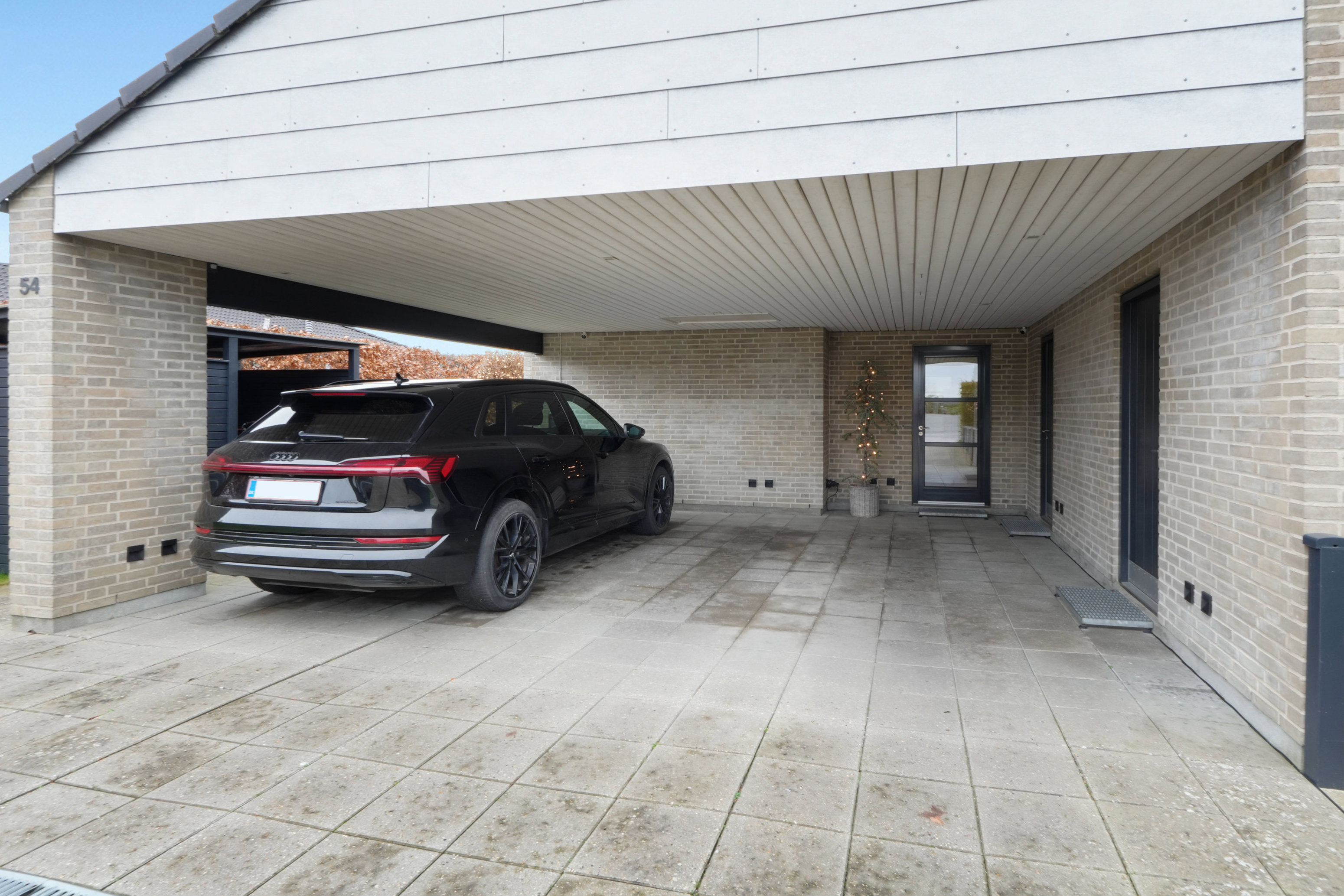 Med sin store, integrerede dobbeltcarport byder ejendommen på ganske mange kvadratmeter under tag. Derfor er det kun naturligt, at huset har en afdæmpet fremtoning med lyse murstensfacader under sit sorte betontag. Udtrykket er dermed ikke tungt, men let, og i vid udstrækning har man valgt vedligeholdelsesfri materialer, som giver villaen et stærkt, funktionelt fundament.