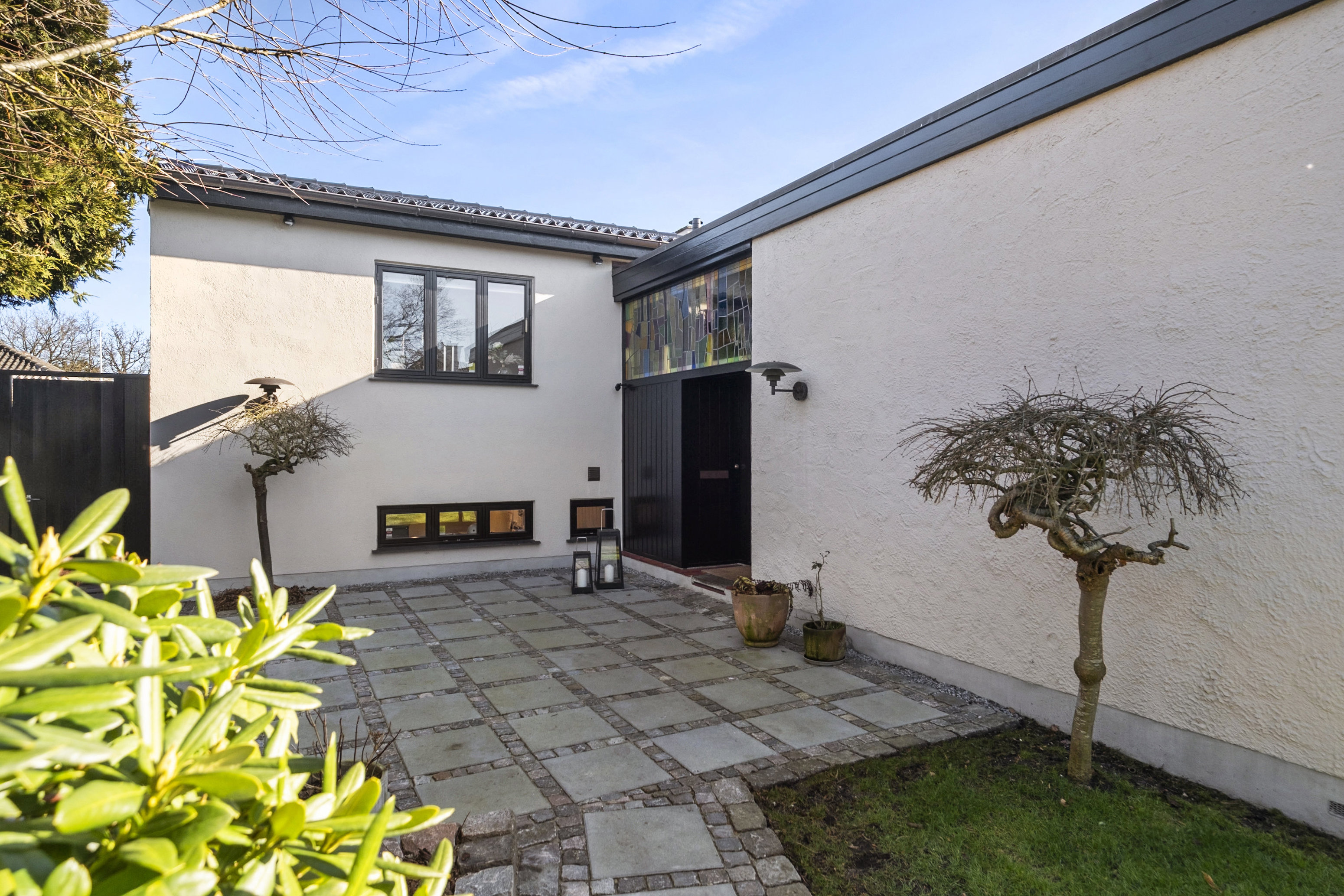 Huset er designet ud fra sollyset, og det var lige præcis det, som PH var så suverænt dygtig til. Der er loftsvinduer og kæmpe vinduespartier i hele ejendommen, så her er et overvældende, men samtidig blidt og behageligt lysindfald overalt. I de store opholdsrum åbner markante glaspartier sig ud mod haven, så lyset har fri passage, mens I er i kontakt med alt det grønne. Den samme genistreg ses i de tre store værelser. De åbne rumforløb og de højtplacerede glasbånd i stuerne sikrer, at dagslyset føres dybere ind i boligen. PH har derudover leget med lys og farver i de blyindfattede ruder.