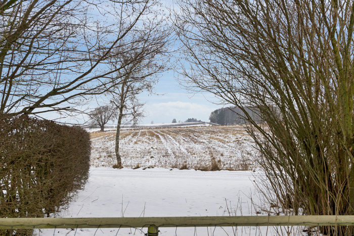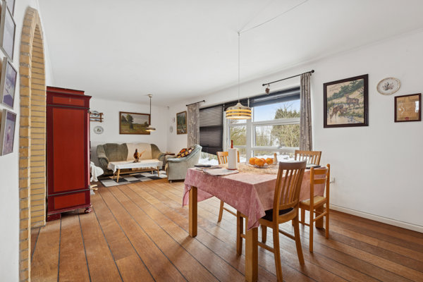 Engmarksvej 3, Syrehusene byder dig velkommen med en rolig atmosfære, indrammet af åbne marker og nærheden til skovens grønne rum. Hverdagen leves i et nabolag, der summer af tryghed, hvor lydene dæmpes af den stille vej og udsigten over landskabet lader tankerne finde ro. Her bliver grænserne mellem inde og ude næsten usynlige, når stuen åbner sig mod terrassen og haven via store dobbeltdøre og vinduespartier, der elegant trækker naturen helt ind i huset.