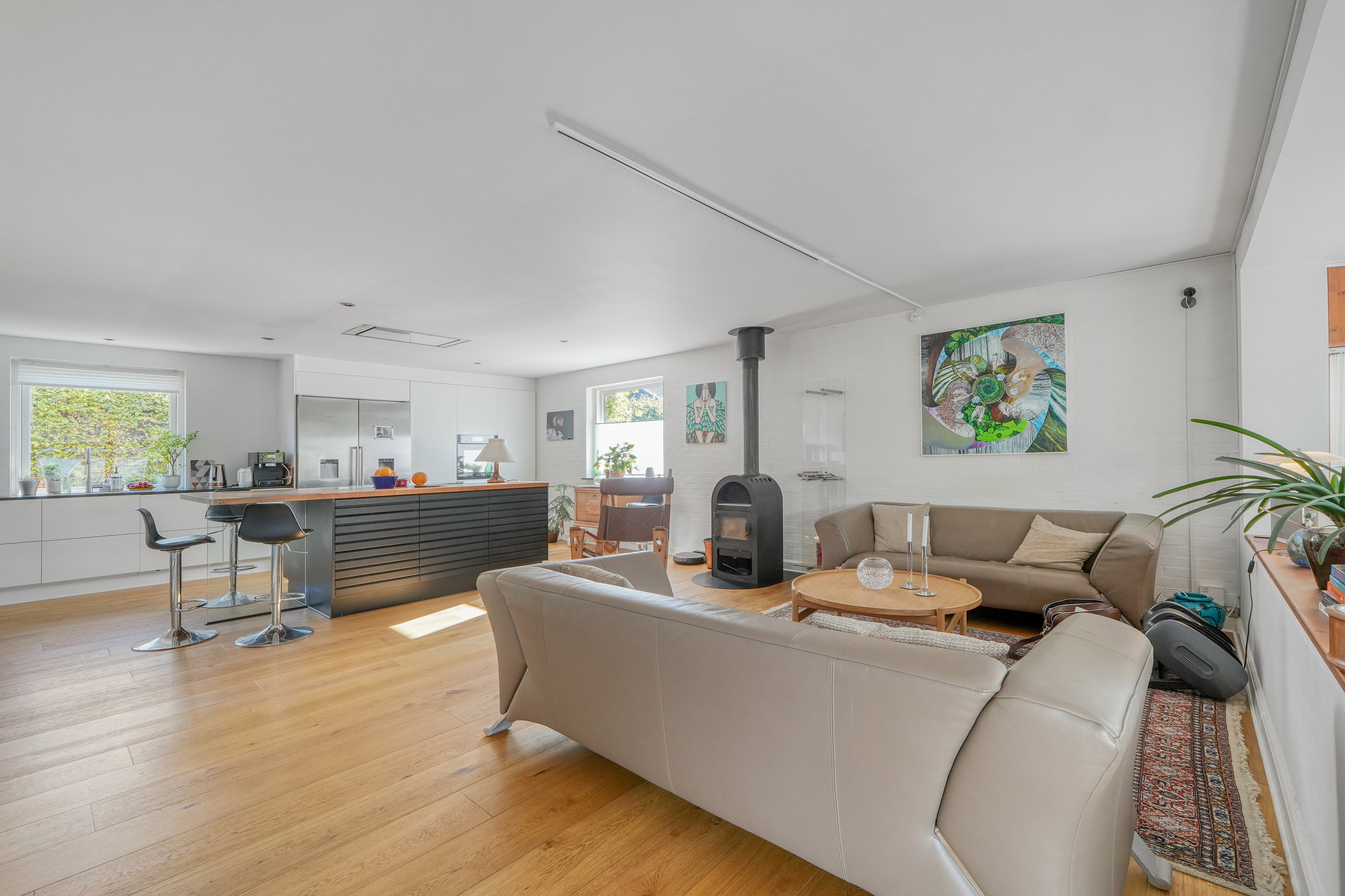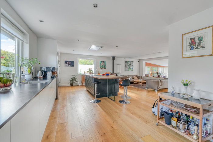 Inden døre har man spenderet energien helt rigtigt. Der er gennemgående egetræsgulve, og særligt det åbne opholdsområde er en kærkommen tilføjelse. Afdelingen samler stuen og køkken-alrummet, der er fra 2018 og udført med interiør fra Svane Køkkenet. Rummet byder på matsort og hvidt, grebsfrit inventar, og I får blandt andet en lækker, sort granitbordplade i fuld længde. Over kogeøen har man installeret et loftmonteret emfang for sammenhængens skyld, og dertil får I en hyggelig brændeovn.
