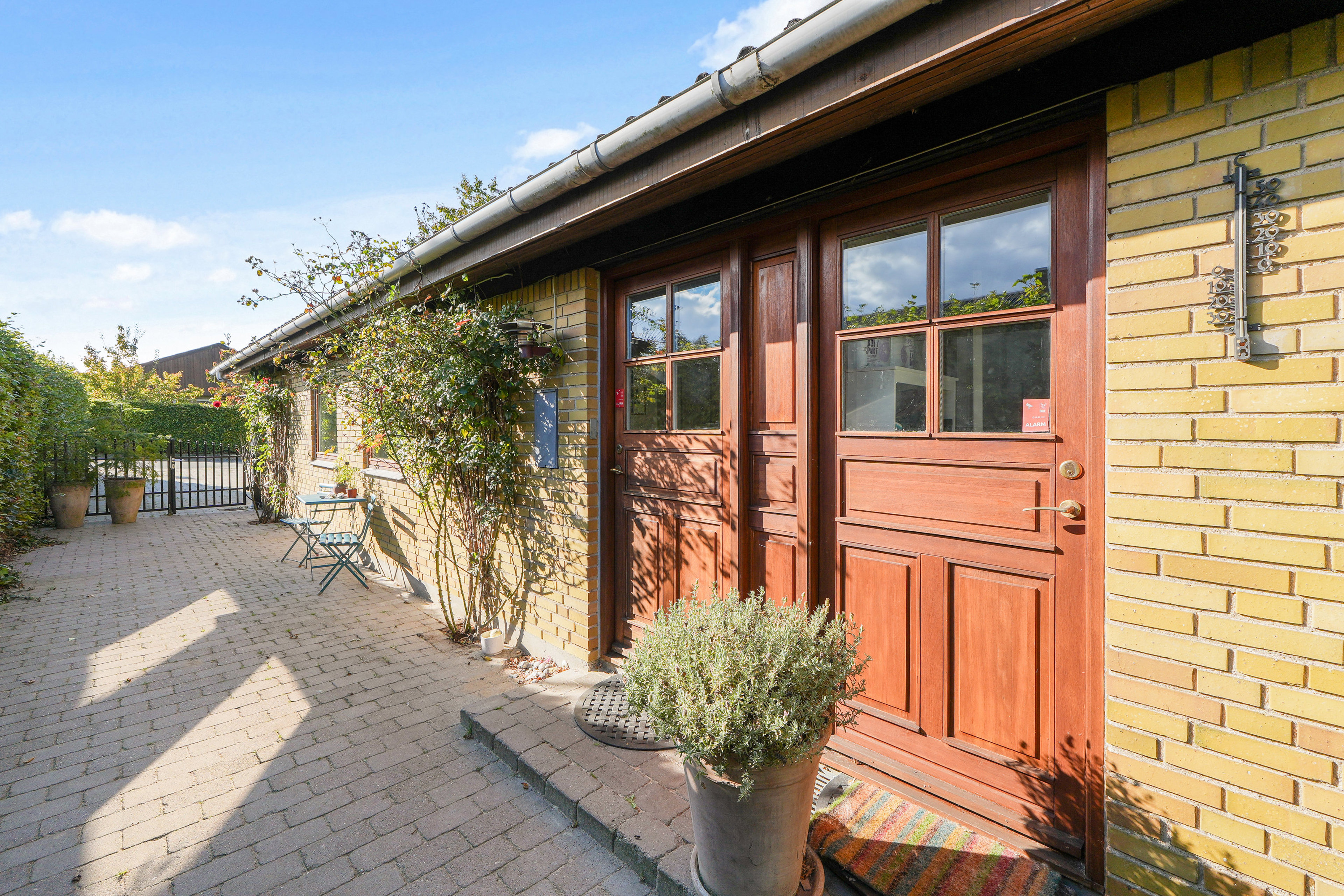 Huset ligger fredeligt bag hækken, kirsebærtræet og syrenerne i forhaven, hvor villaen blev bygget i 1973. Indtrykket er overvejende klassisk – nemlig af en pæn, pragmatisk og funktionel etplansvilla i gule mursten. Der er plads til et par biler i indkørslen, og derudover får I en stor carport.