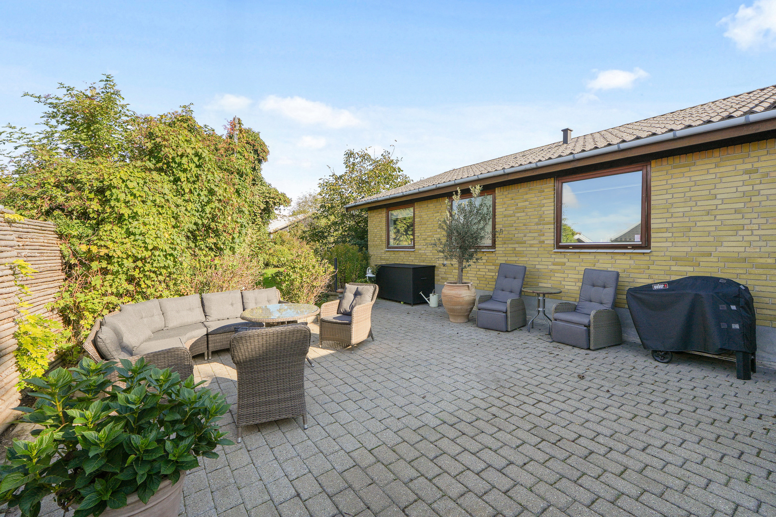 Haven er lidt af et frirum – også for den velvoksne beplantning, som får lov at fylde godt. Derfor er stemningen grøn og hyggelig, men I kan selvfølgelig også tynde lidt ud i trætoppene, hvis der skal være plads til en havetrampolin. Fordelen er dog, at haven i sin nuværende form hører til de absolut mere ugenerede af slagsen.