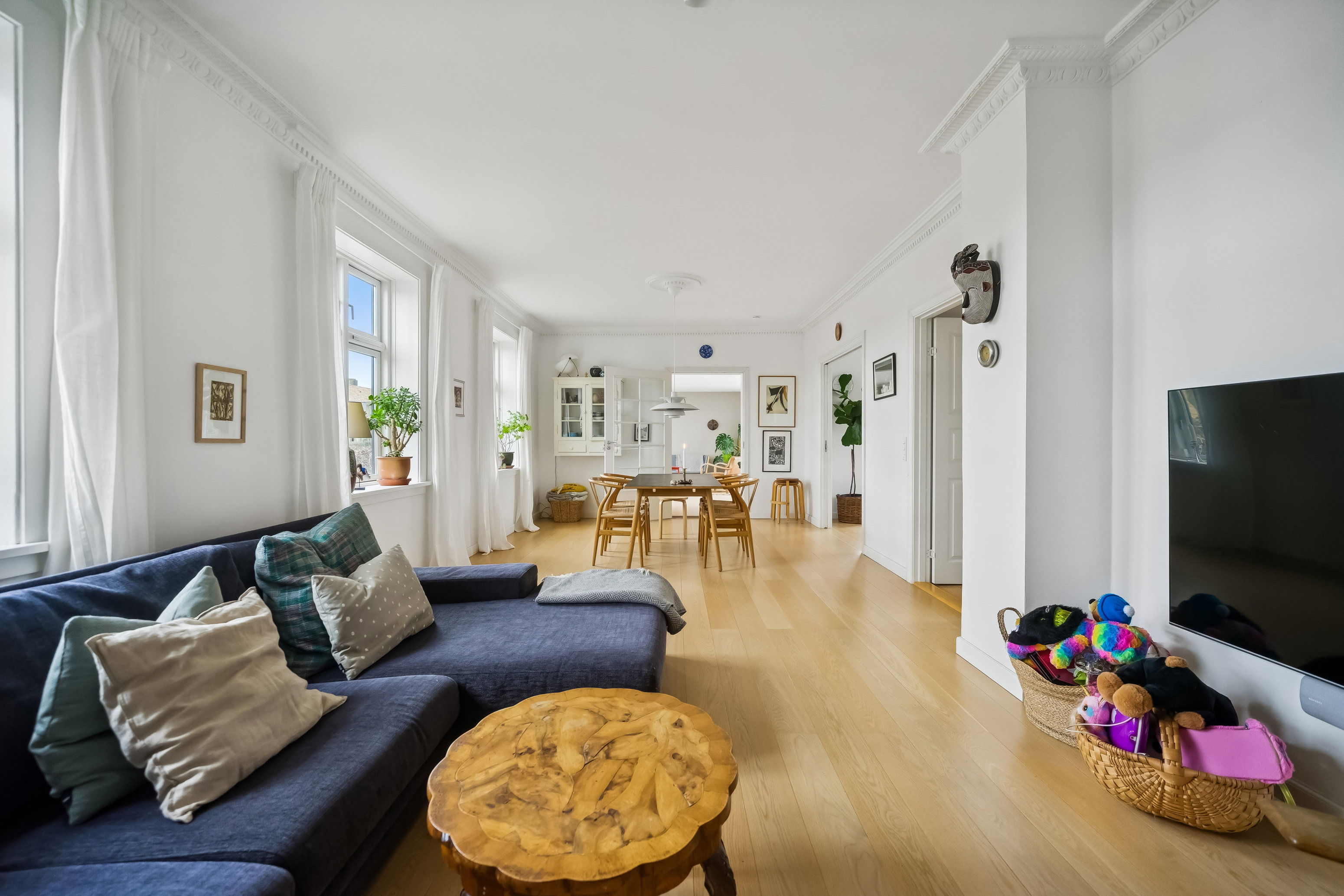 Ensartede gulve binder etagerne elegant sammen, og i stueplan sætter stuklofter et herskabeligt præg. Entréen leder forbi et gæstetoilet og et værelse, der kan anvendes som kontor eller gæsteafsnit. Herfra fortsætter planløsningen ind i opholdsmiljøet, hvor stuen og det stilrene køkken ligger i åben forbindelse. I forlængelse finder I endnu en stue, der tilsmiles af et generøst lysindfald fra flere sider. Førstesalen samler tre værelser og et flot badeværelse med kar og separat brus, mens I øverst oppe får ét stort værelse. Sidste stop er kælderen, som supplerer med flere disponibelt rum, et vaskerum og endnu et badeværelse.
