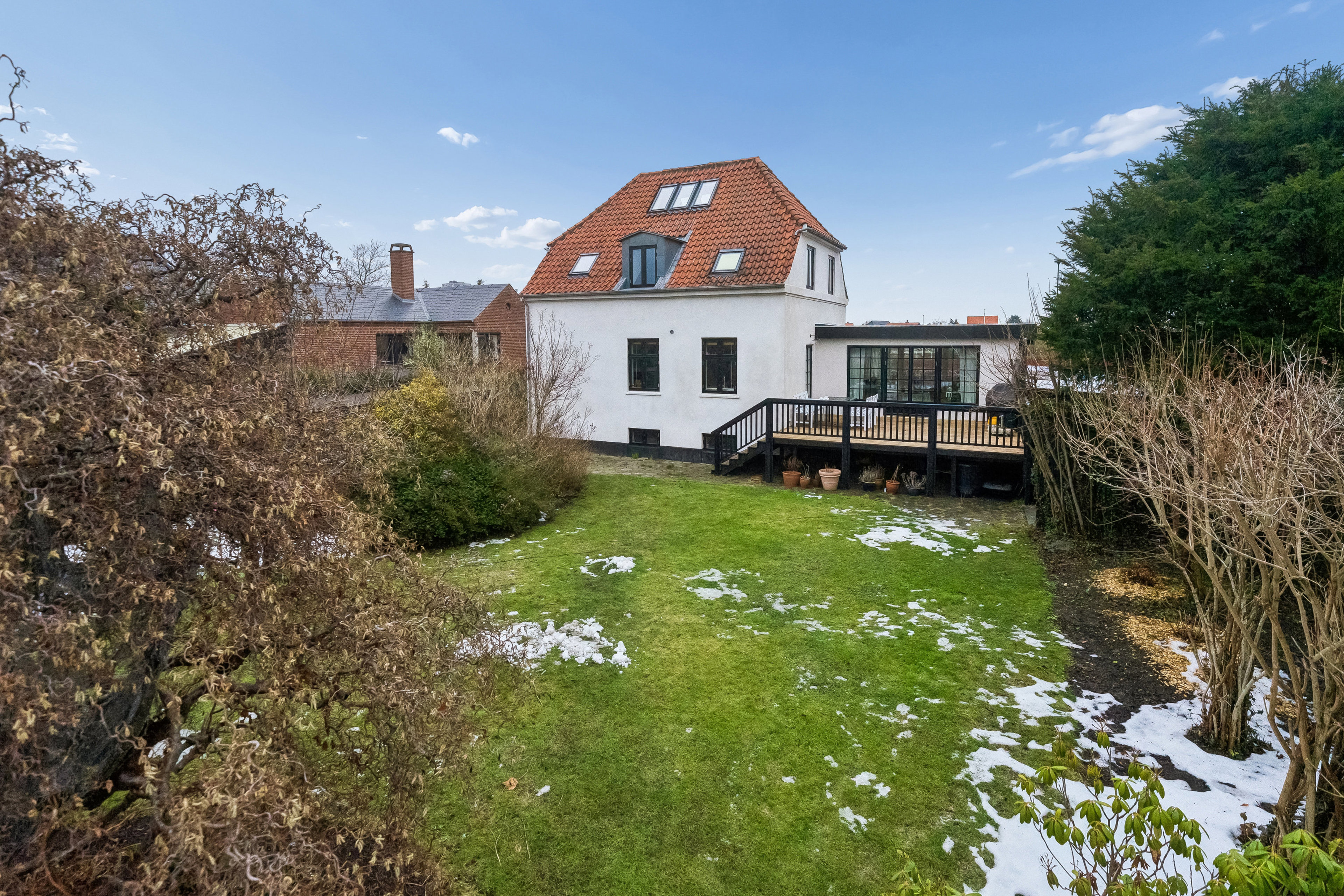 Jeres kommende hjem har prydet adressen siden 1927, og her står det stadig smukt med sin hvide facade, sorte dannebrogsvinduer og halvvalmet tag. Fra den bagerste stue åbnes dørene op til en solrig terrasse med udsigt over jeres private haveoase. Her kan sommerdagene få frit spil med tagfat, trampolin eller blot med afslapning under åben himmel, alt imens solens stråler fra vest forlænger dagene og lyser aftenerne op.