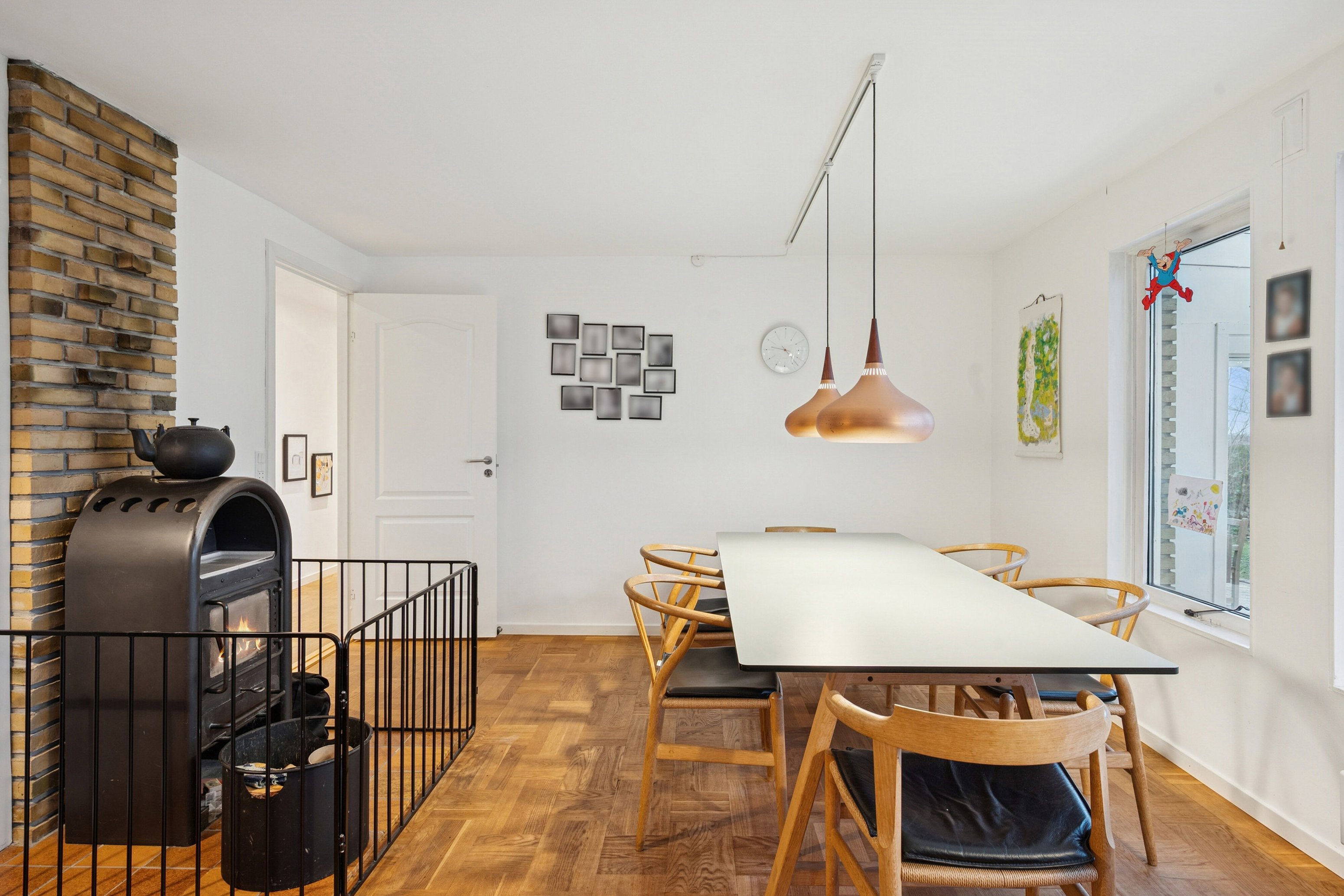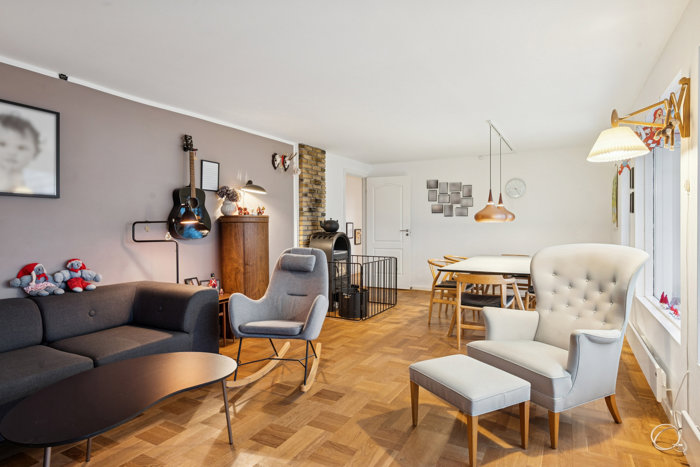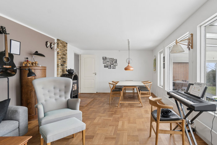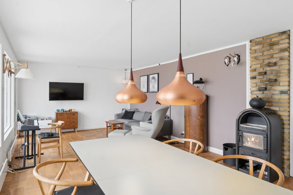 I stuen strømmer solen ind fra syd, og herinde bemærker I det pæne gulv, brændeovnen og udgangen til den store udestue, som skaber en harmonisk sammenhæng mellem ude og inde.