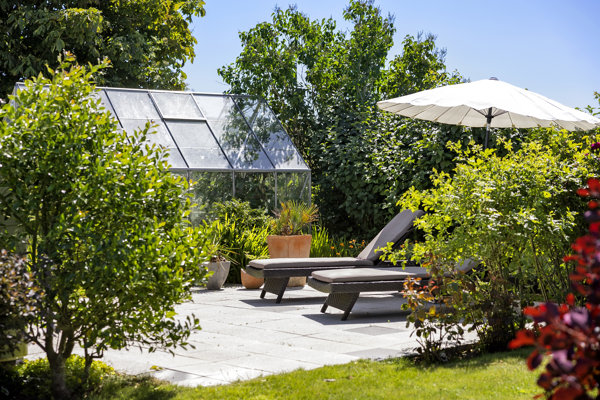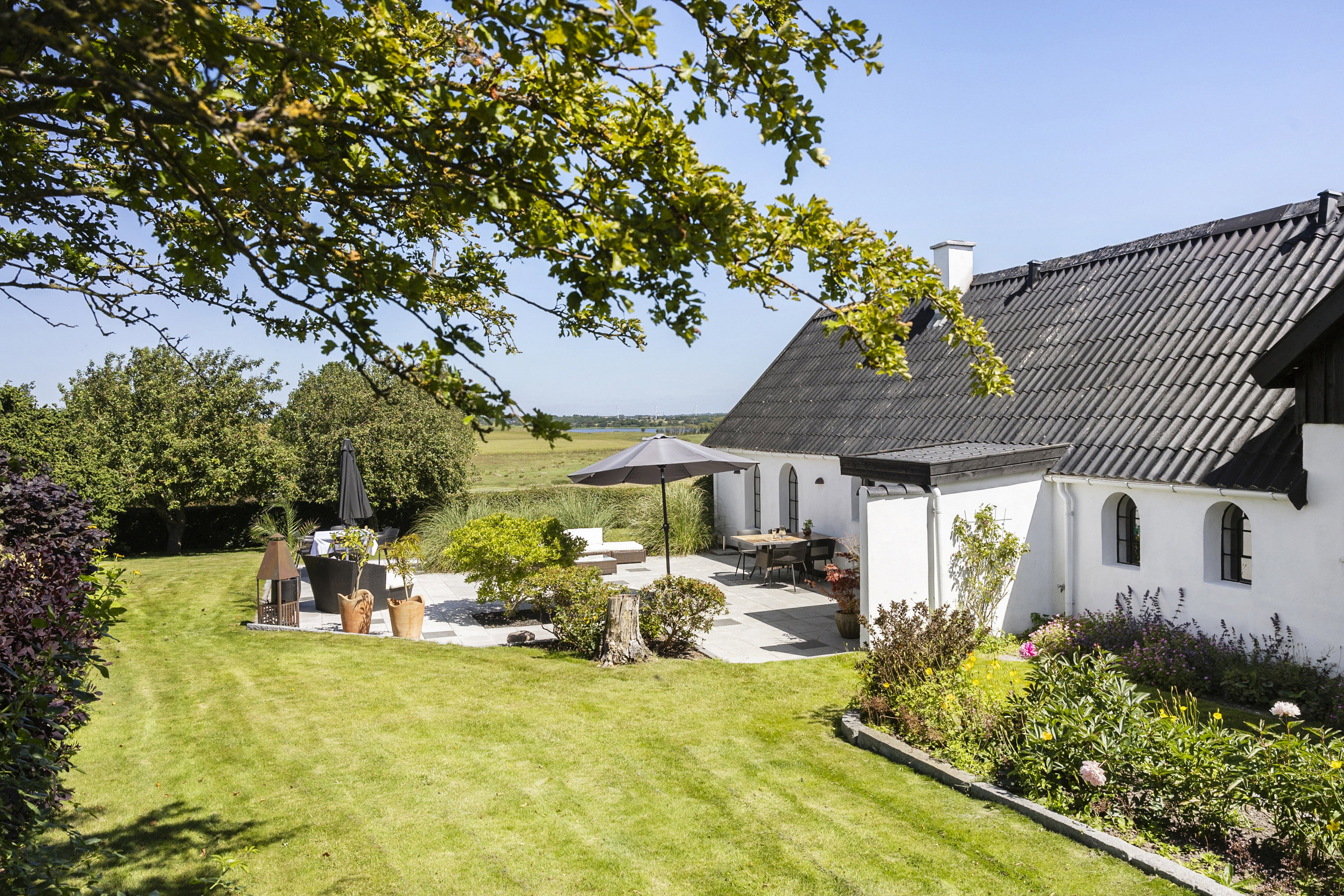 Der er 3 store terrasser med plads til familiefester og en fantastisk udsigt. Haven har desuden hyggelige kroge, hvor man kan lave bål eller nyde en stille stund med en bog.