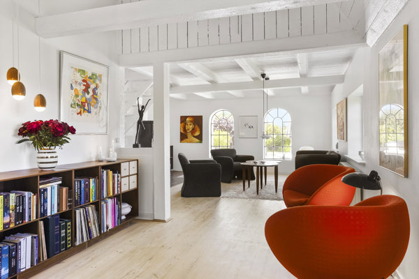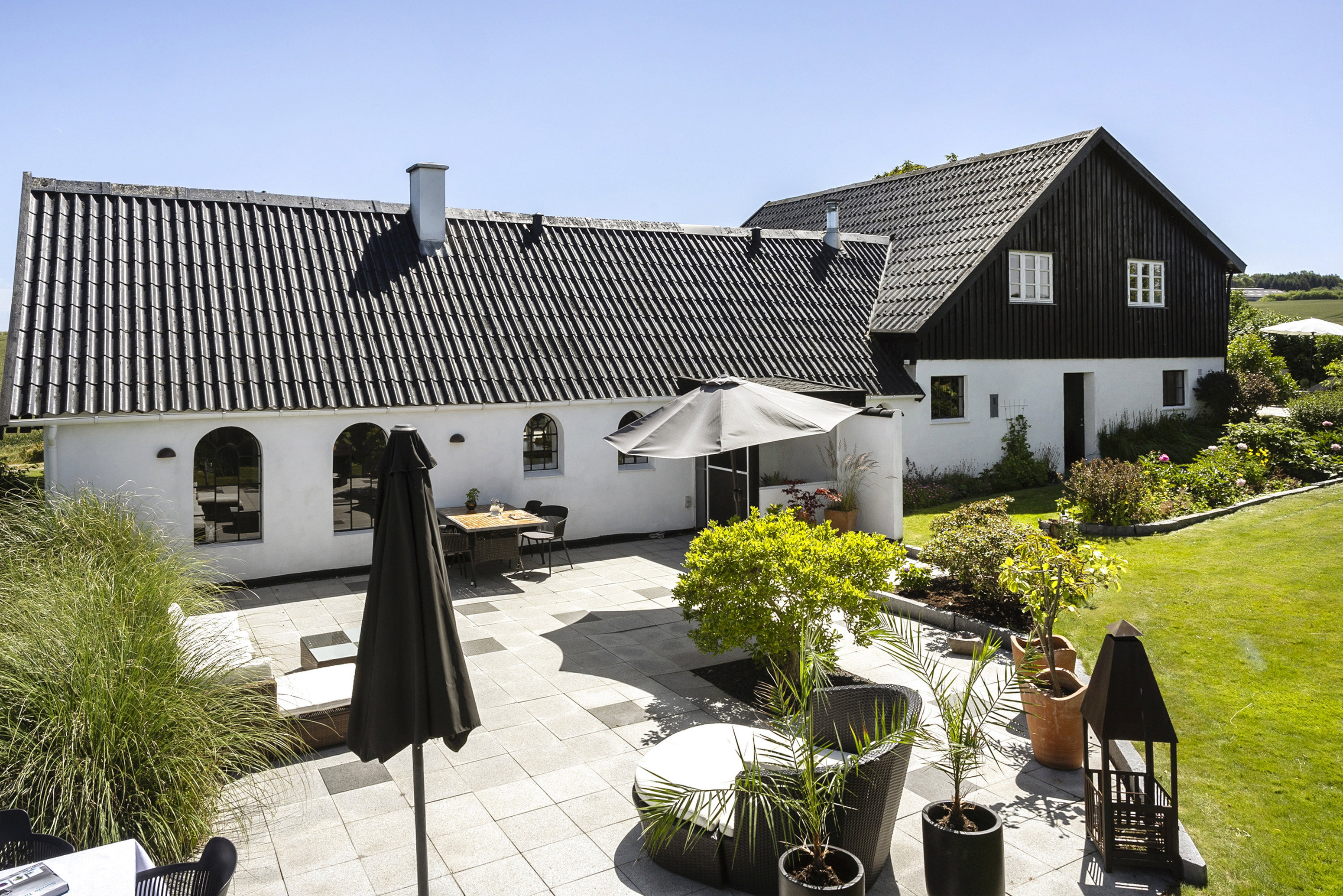 Når du drejer ind i gårdspladsen, mærker du straks den hyggelige landidyl, med smuk hvid facade, og sprossede vinduer. Indvendigt er der 249 kvadratmeter bolig, samt et ekstra rum på 75 kvadratmeter, der kan bruges til forskellige formål, for eksempel gildesal.