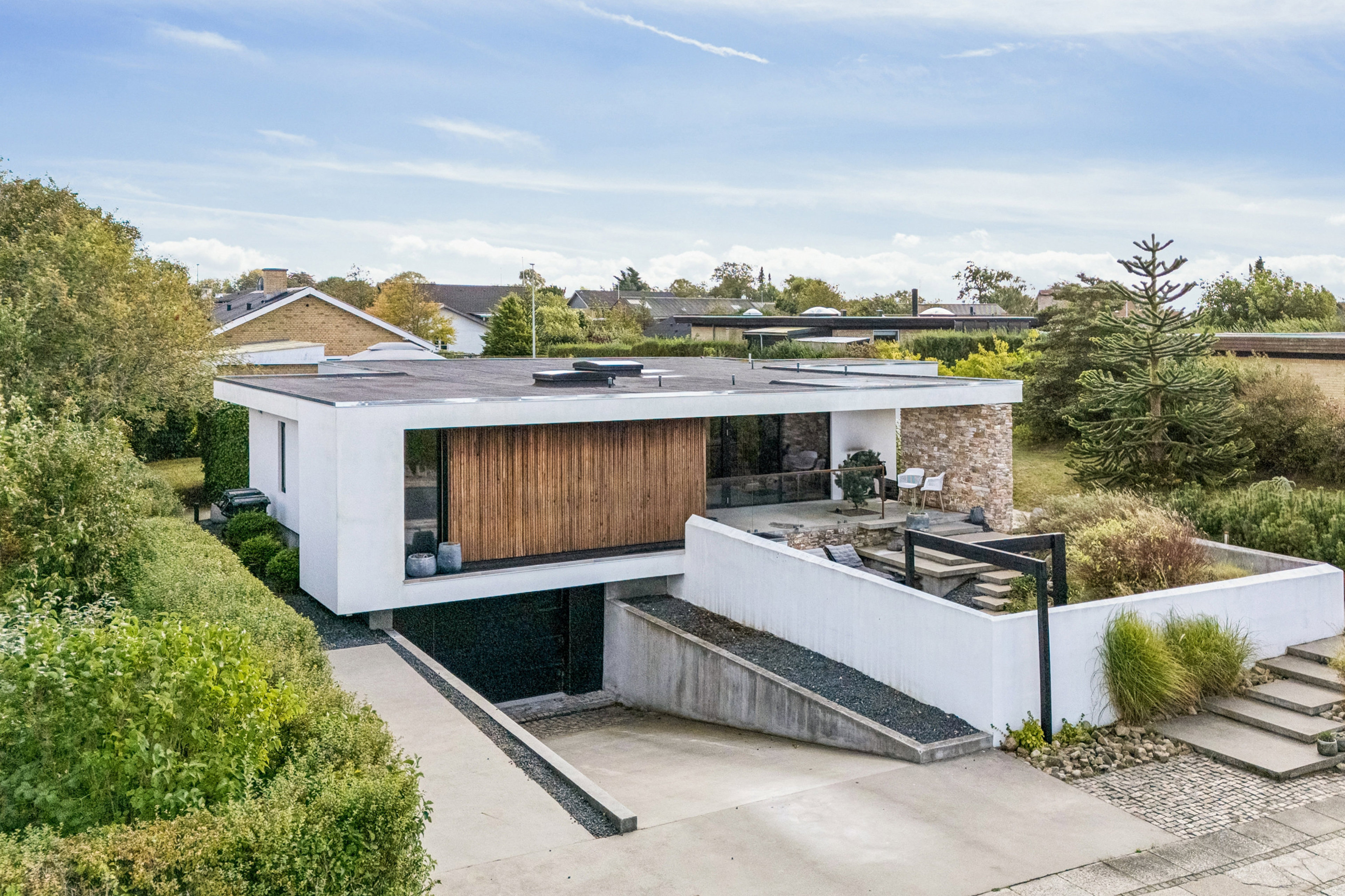 Frederiksgade 98 er bygget i 1967, men gennem en omfattende renovering fra 2021 fremstår huset som et hjem i særklasse – med rene linjer, fladt tag og en elegant hvidpudset facade, hvor natur sten og træ skaber varme og karakter.