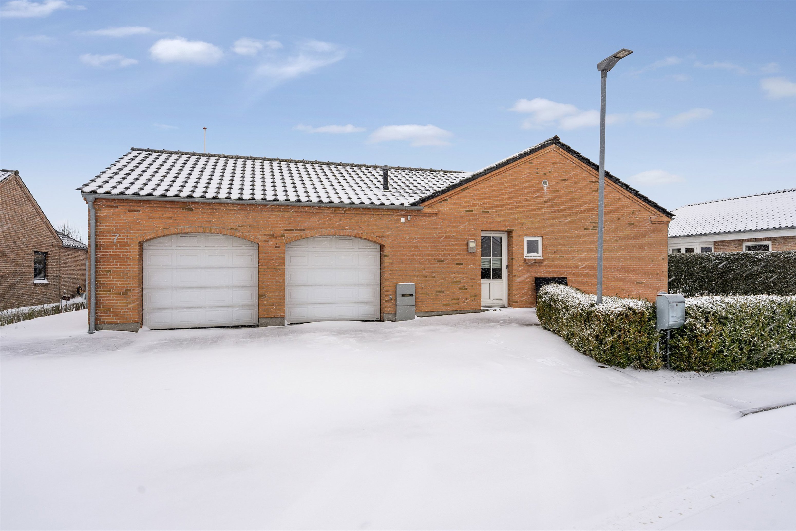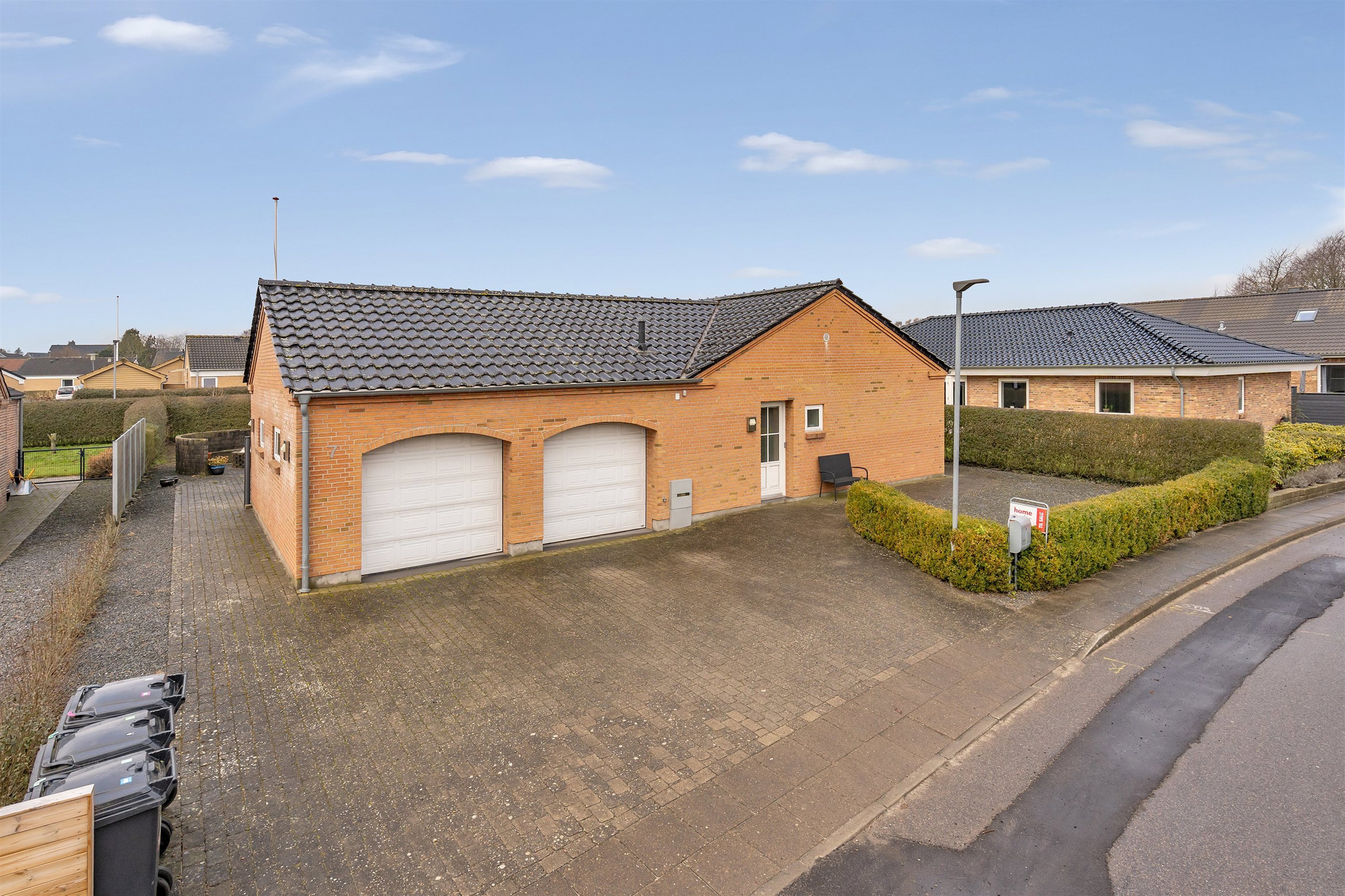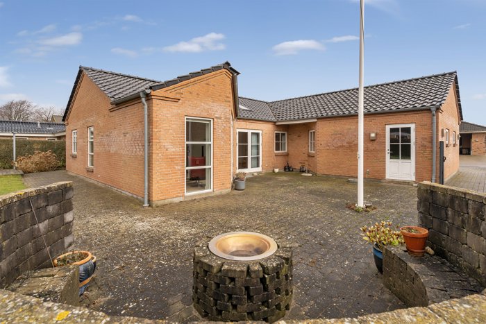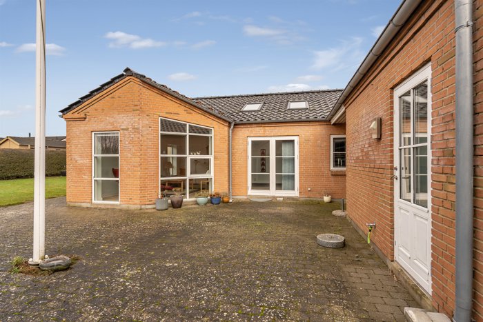 Villaen er opført i en flot U-form, som skaber et læfyldt og privat atriumlignende terrassemiljø – et skønt uderum, der naturligt forlænger boligens opholdsarealer i sommerhalvåret.