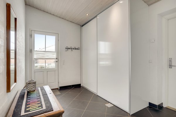 Boligen indeholder en rummelig entré med direkte adgang til den integrerede garage. Garagen rummer plads til to biler, er udstyret med elporte og indeholder både vaskefaciliteter og gode opbevaringsmuligheder. Herfra er der endvidere praktisk udgang til terrasse og have.