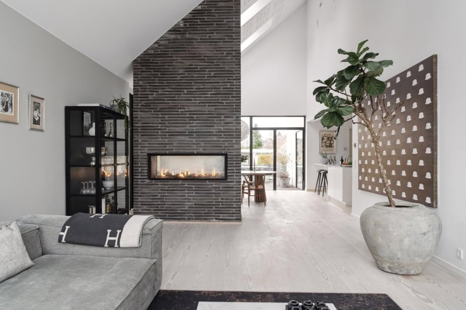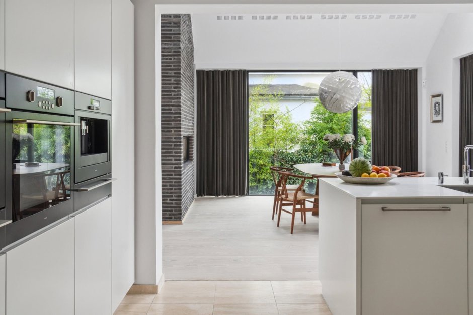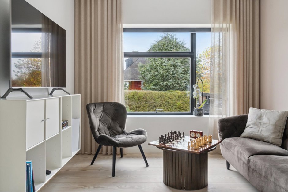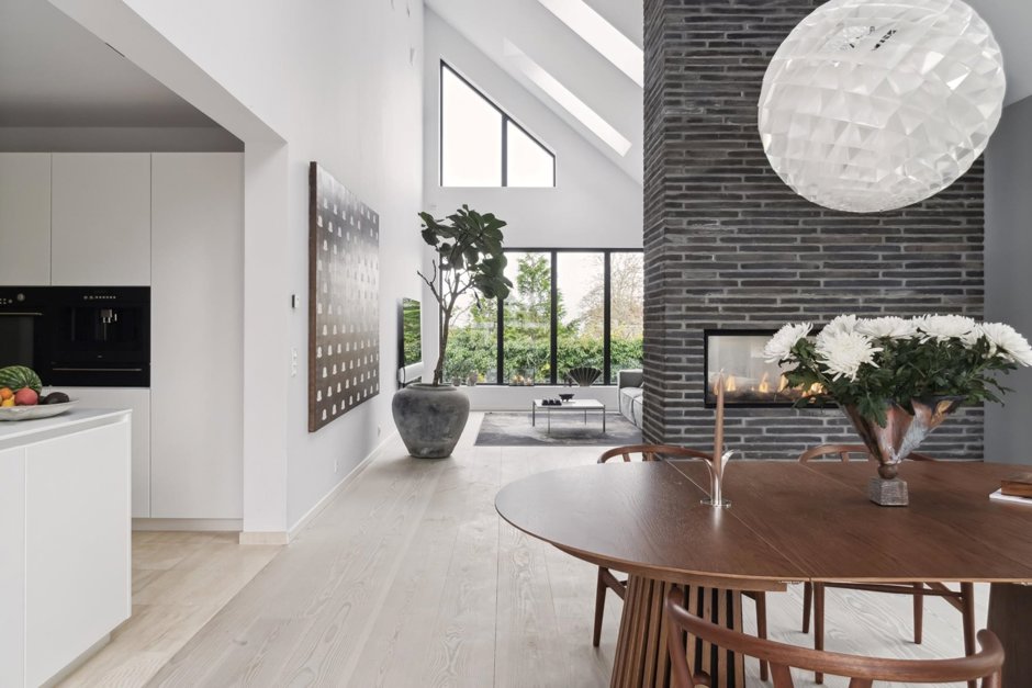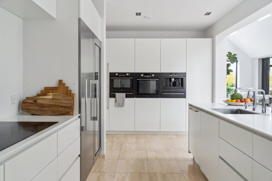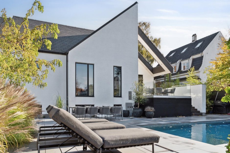 Gaspejsen skaber en opdeling mellem stue og alrum, og videre endnu har I køkkenet med oceaner af skabsplads og integrerede ovne samt kaffemaskine. Det omfangsrige hjem byder også på seks værelser, to badeværelser, træningsrum, og listen fortsætter. Kronen på værket er haveanlægget med den opvarmede og vedligeholdelseslette saltvandspool som omdrejningspunkt.