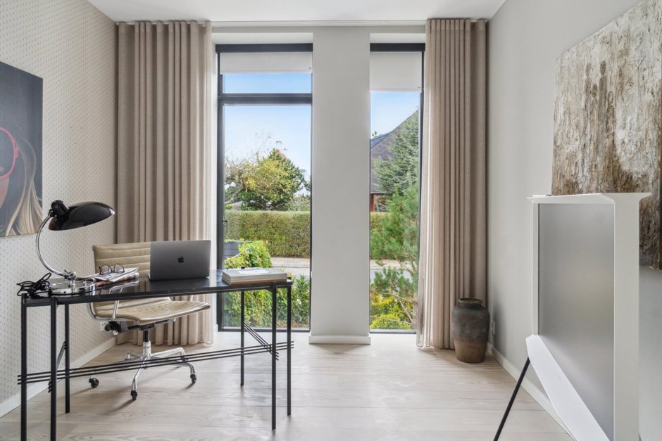 Der er også masser af positive punkter at knytte til villaen, der er arkitekttegnet og opført så sent som i 2016. Byggeriet er et stjerneeksempel på, hvor godt det kan gå, når man nægter at gå på kompromis. Som resultatet ser I frem til at bosætte jer i et strømlinet og toplækkert hjem med nøgleord såsom 6,5 meter til loftet, gennemgående Dinesen-gulve og gulvvarme.Kigger I ordentligt efter, er der fra stuen udsigt til havet, og påtænker I at udnytte den imponerende loftshøjde med en hems, får I således endnu mere af det smukke blå at se.