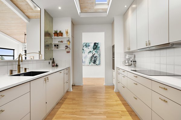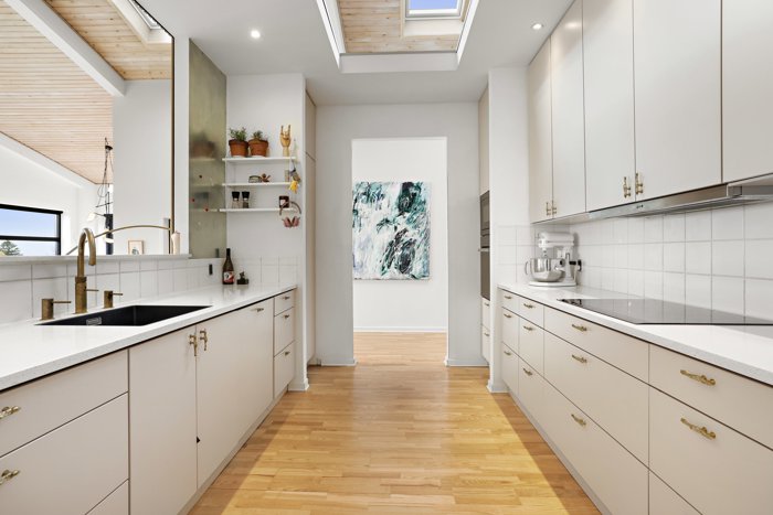 Køkkenet er opdateret med nye låger, ekstra skabe og flotte greb, som matcher boligens enkle linjer. Samtidig er der etableret fire nye ovenlysvinduer over køkken og stue i 2025, hvilket giver et endnu smukkere lysindfald og understreger rummets åbne karakter.