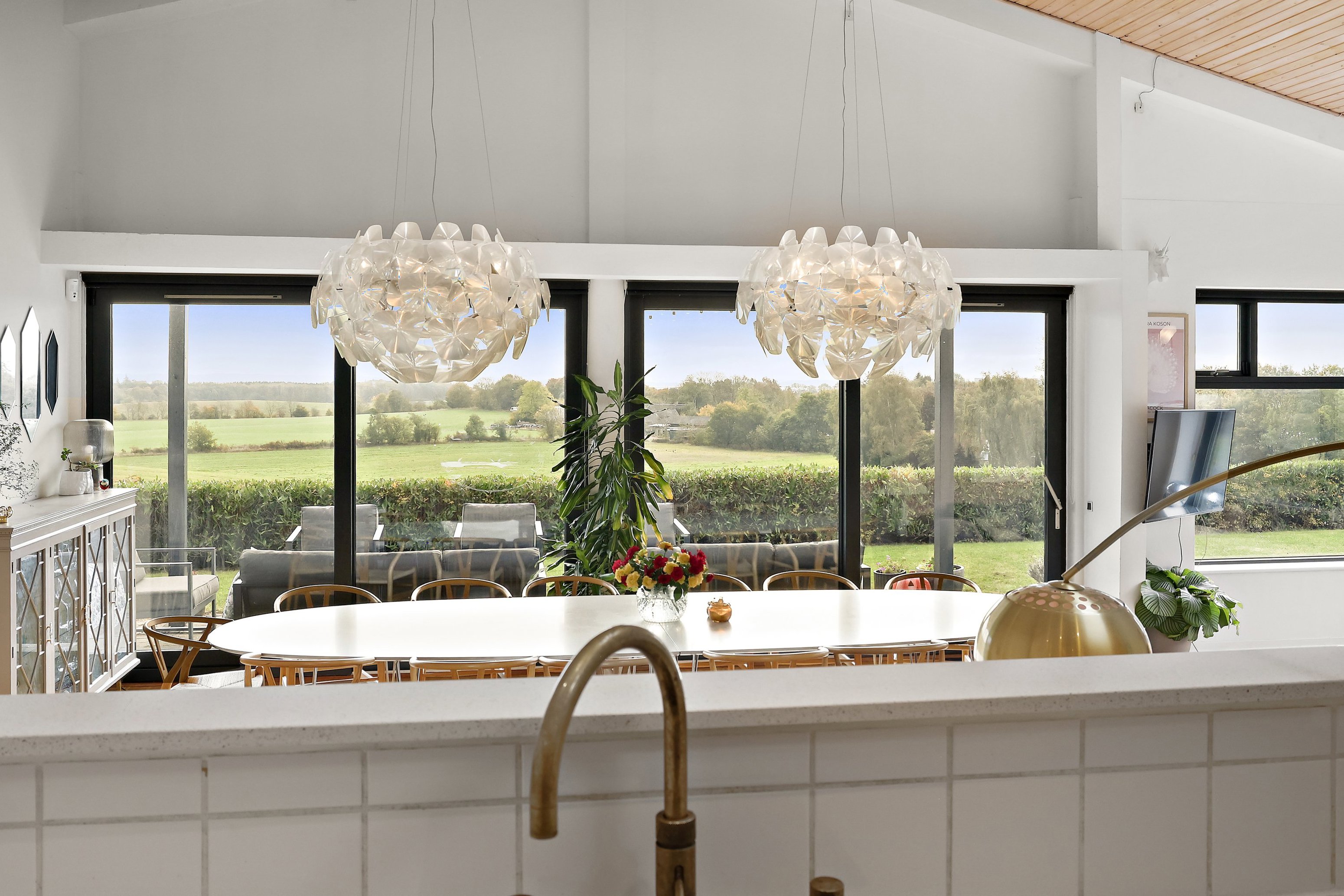 Indenfor mødes du af en lys og luftig atmosfære, hvor boligens naturlige samlingspunkt er det store opholdsrum med loft til kip og panoramavinduer, der lader lyset strømme ind og skaber en smuk forbindelse mellem inde og ude. Køkken, alrum og spisestue er samlet i ét åbent rum, hvor varme trægulve og velvalgte detaljer understøtter det arkitektoniske udtryk. Den store spisestue giver plads til både hverdagsmåltider og hyggelige aftener med gæster, mens opholdsstuen har direkte adgang til en overdækket terrasse, hvor udelivet kan nydes i al slags vejr.