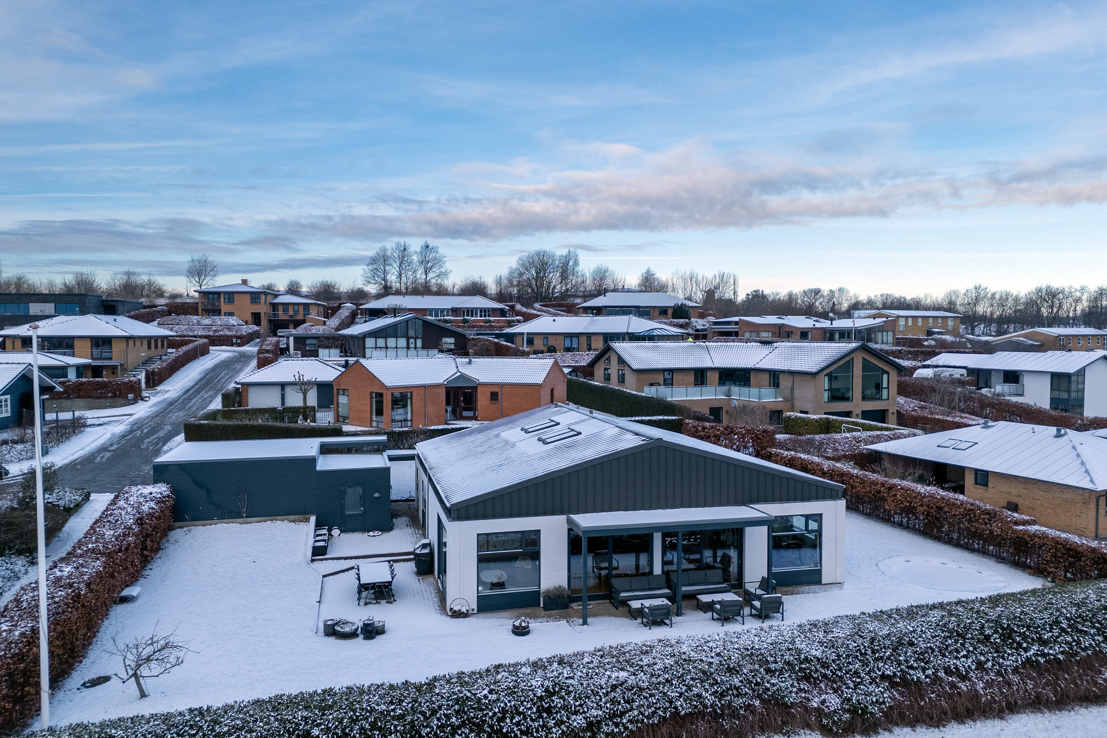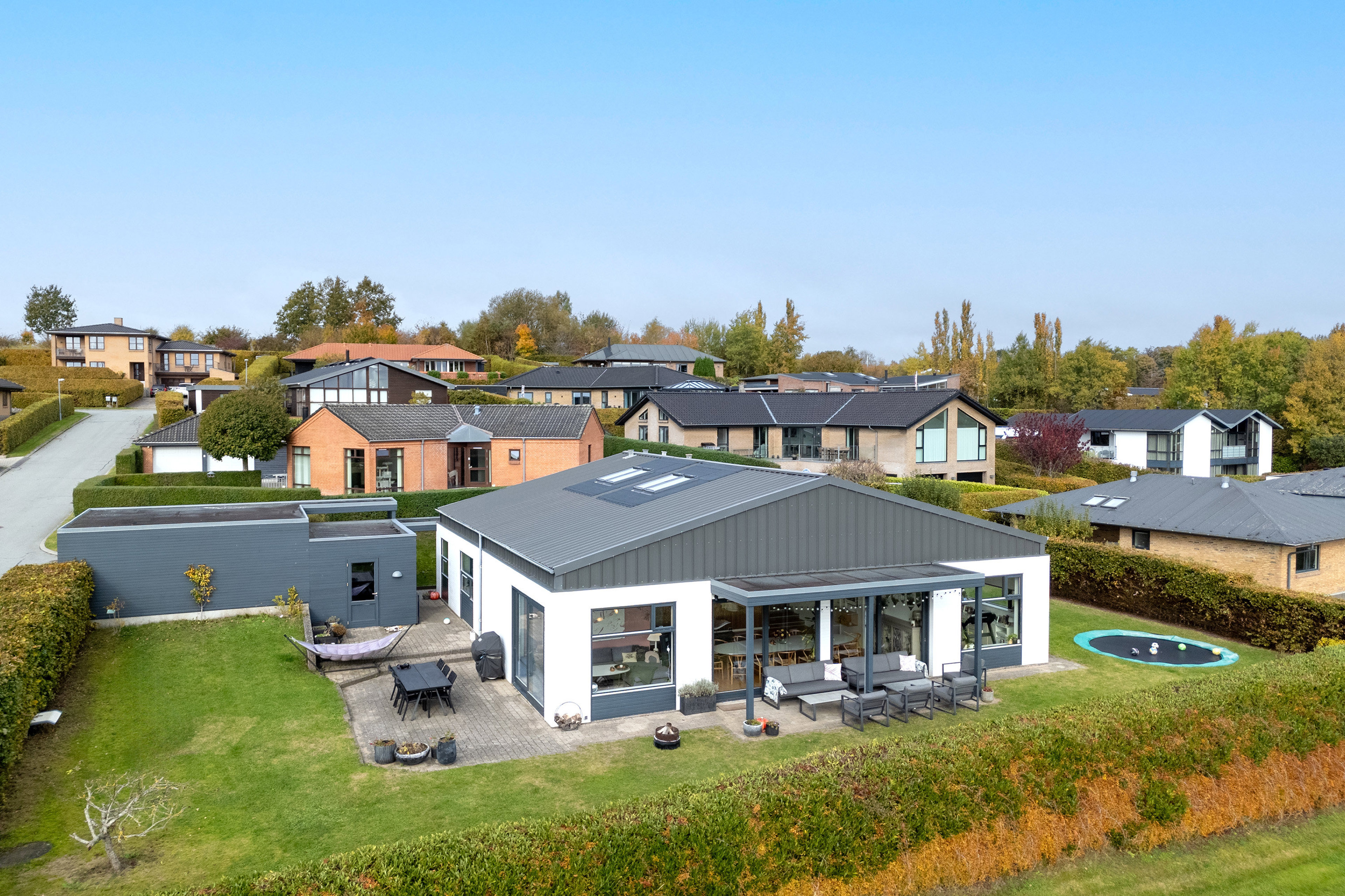 home har fornøjelsen af at udbyde denne moderne og indbydende villa på en naturskøn adresse i det eftertragtede Løgten. På Fruenshøj 32 får du en bolig, hvor gennemtænkt arkitektur og stilrene materialer går hånd i hånd med en rolig og familievenlig beliggenhed. Ejendommen fremstår med et eksklusivt udtryk, hvor den hvidpudsede facade, det mørke tag og de store vinduespartier tilsammen skaber en elegant og tidløs æstetik. Haven ligger ugeneret med en betagende udsigt over åbne marker, og her kan du nyde roen og naturens skiften året rundt.